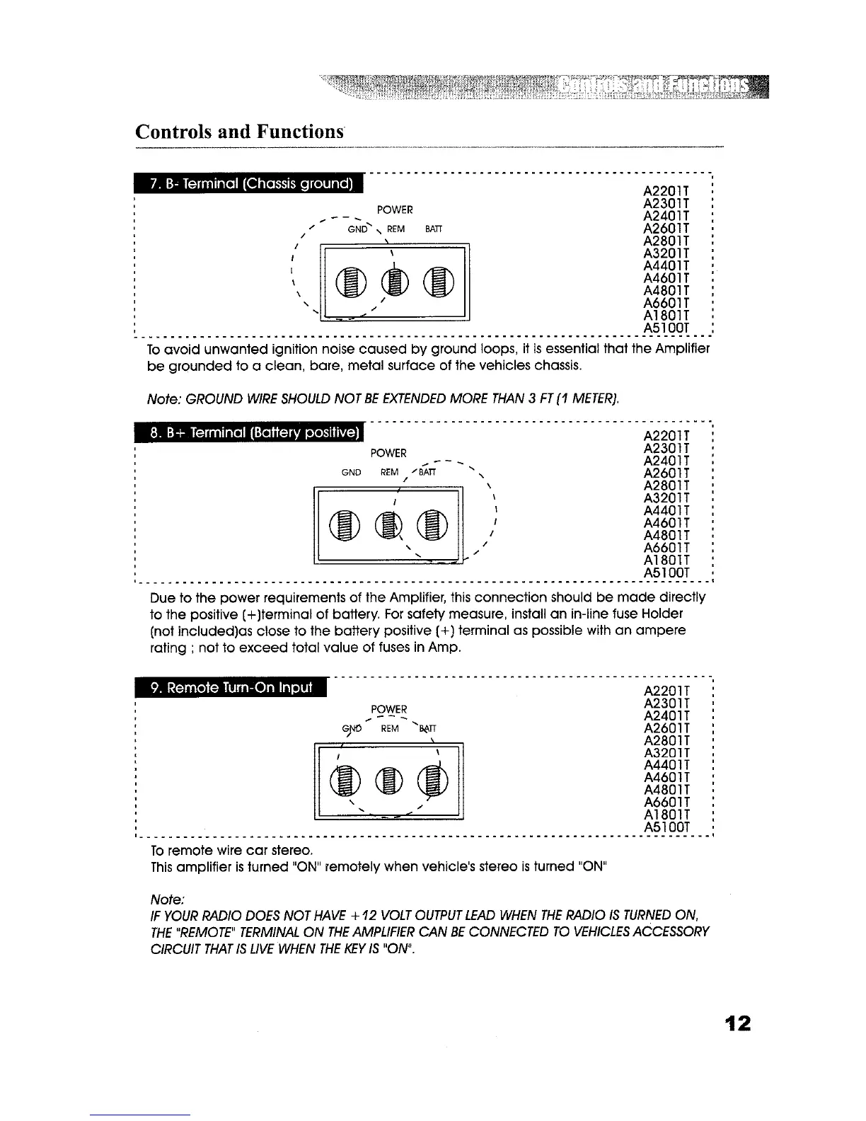 AudioBahn A5100T - Power and Control Wiring; Chassis Ground Terminal Connection; Battery Positive Terminal Connection; Remote Turn-On Input Operation