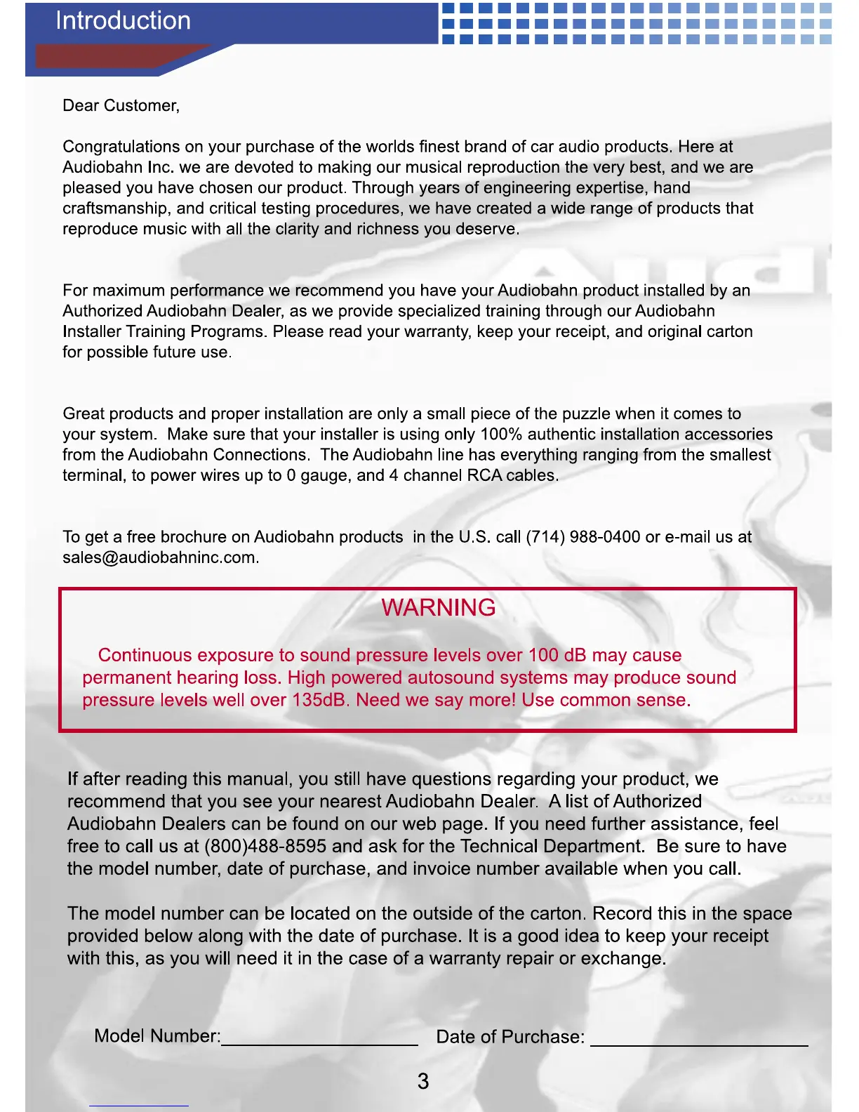 AudioBahn AEQ6Q - Introduction; Safety Warning; Contact and Support Information