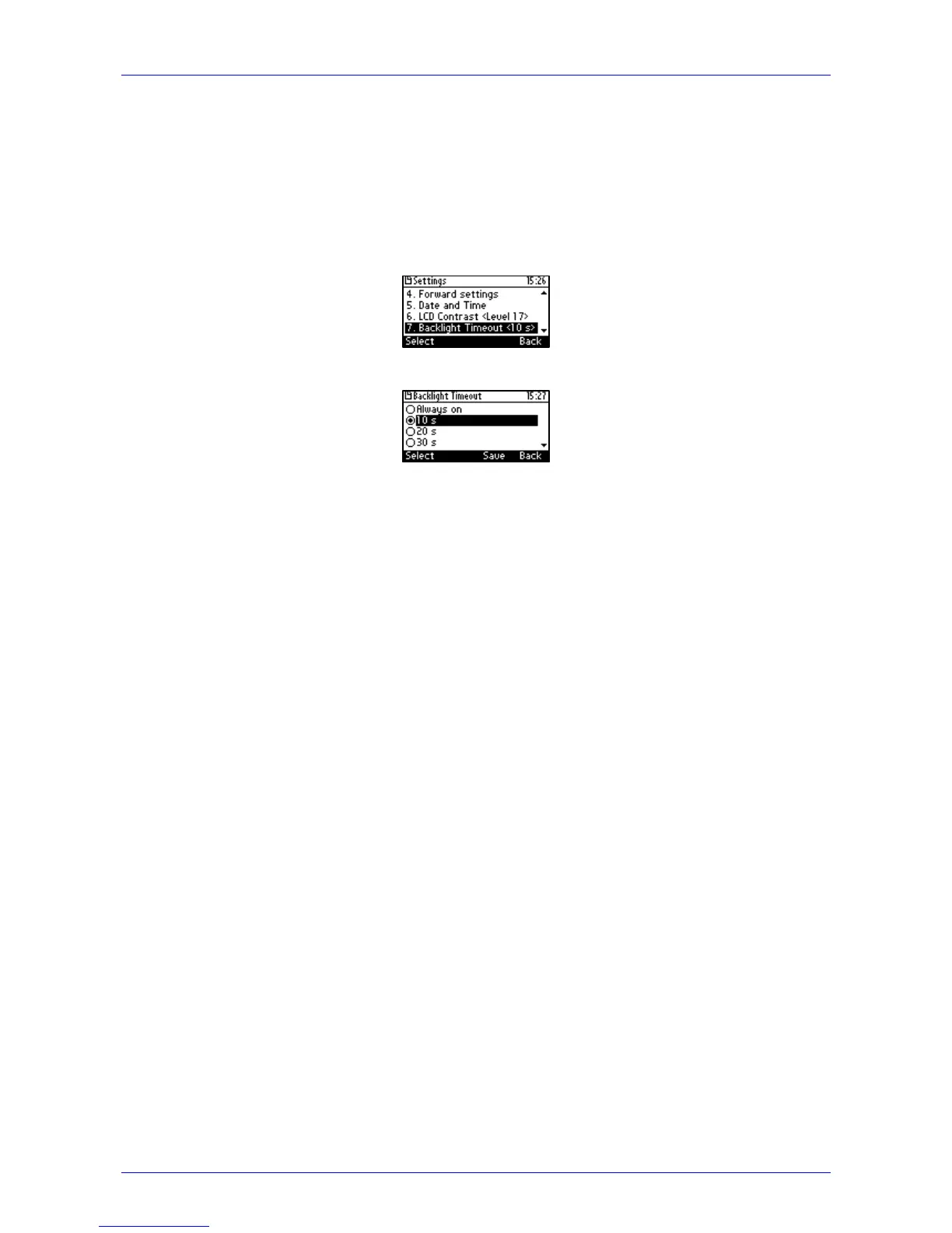 1. Access the Backlight Timeout screen (MENU key > Settings > Backlight Timeout).