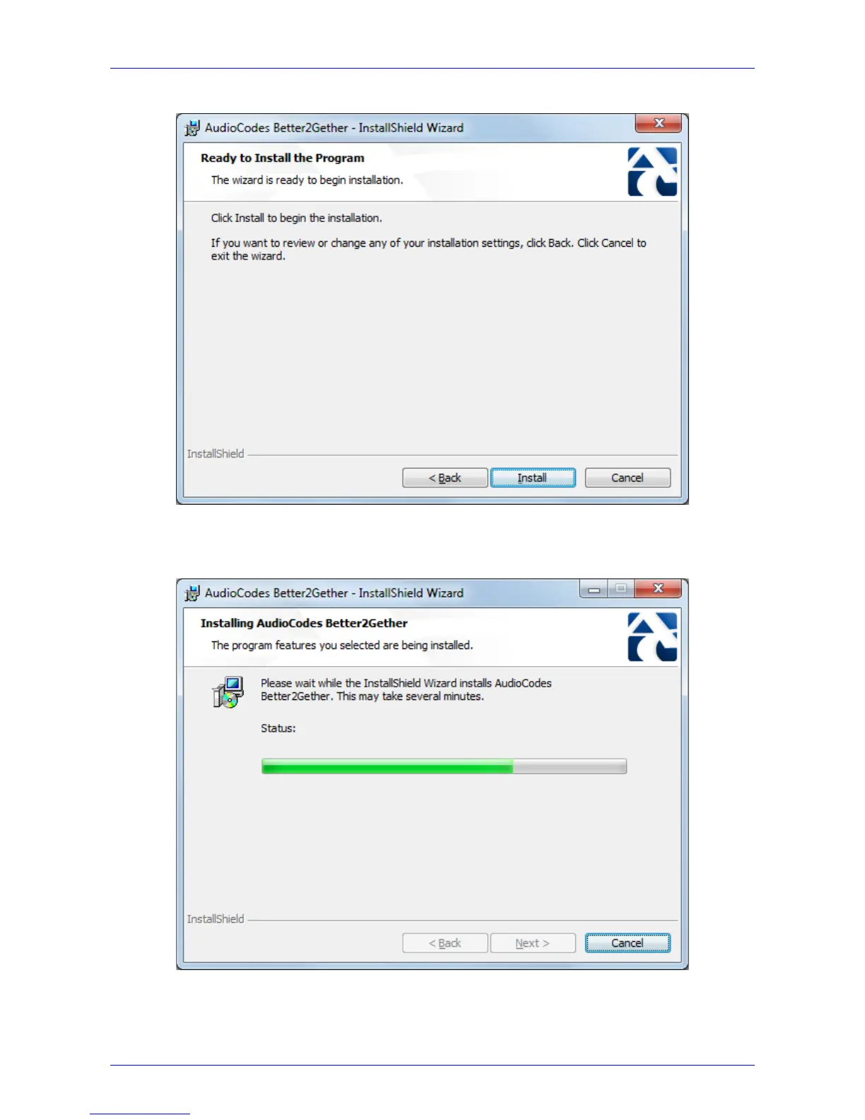 9. Click the Install button; the Installing AudioCodes Better2Gether screen opens indicating