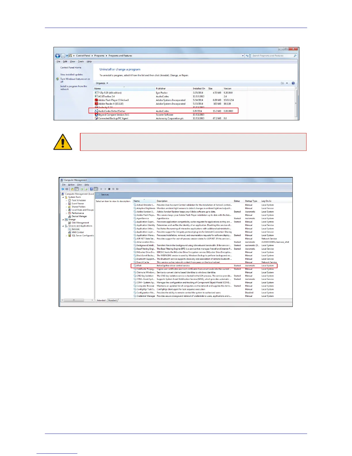 AudioCodes 405HD - Figure 8-11: Control Panel>Programs>Audiocodes Better2 Gether; Figure 8-12: Computer Management > Services and Applications