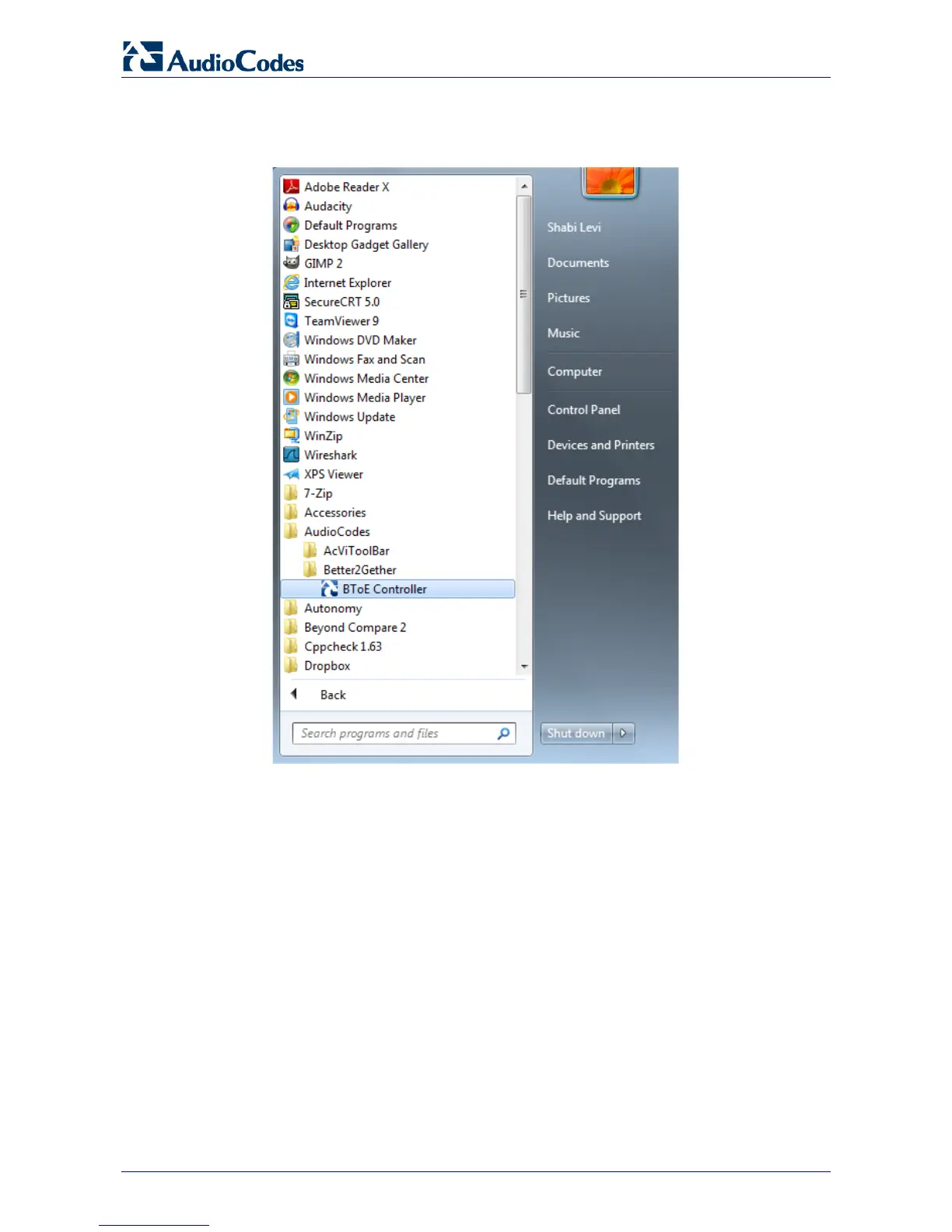 Figure 8-25: Start > Programs > AudioCodes > BToE Controller