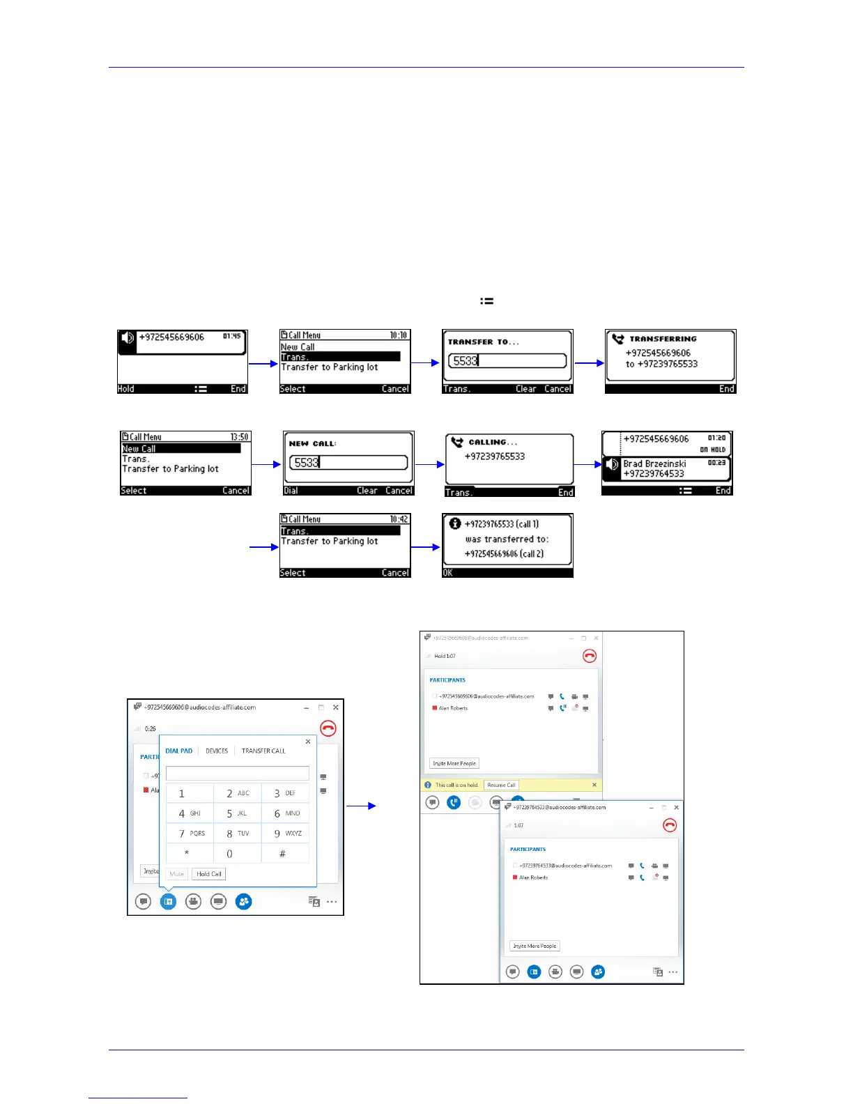 non-consultative (blind) transfer. The operation is mirrored in your phone.
