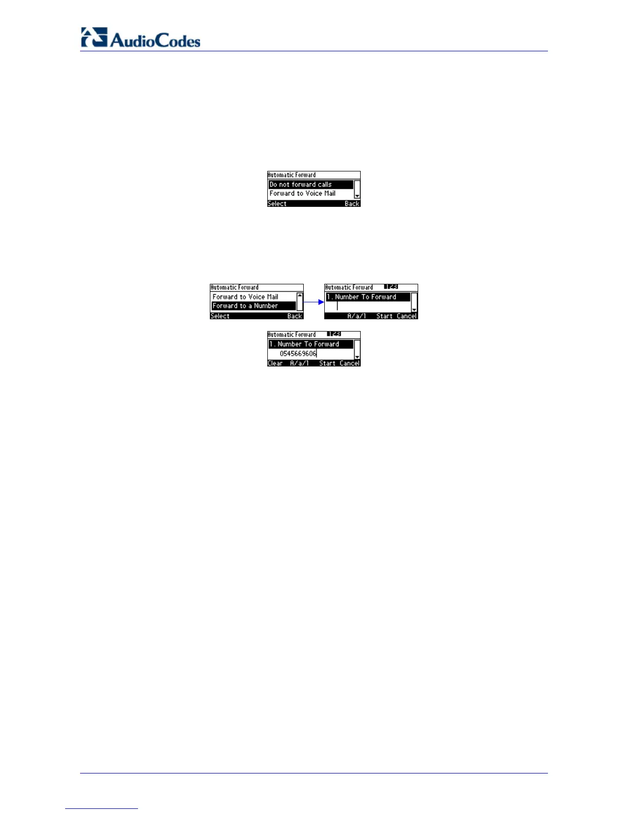 3. To forward to a number: In the Automatic Forward screen, navigate to Forward to a