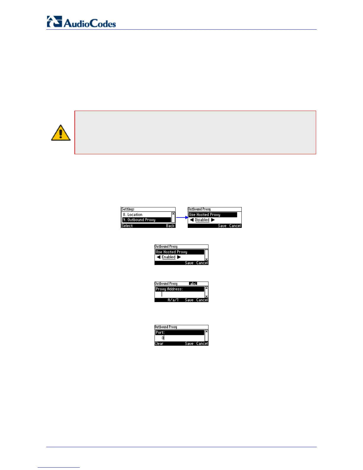 1. In the phone's LCD, access the Outbound Proxy screen (MENU key > Settings >
