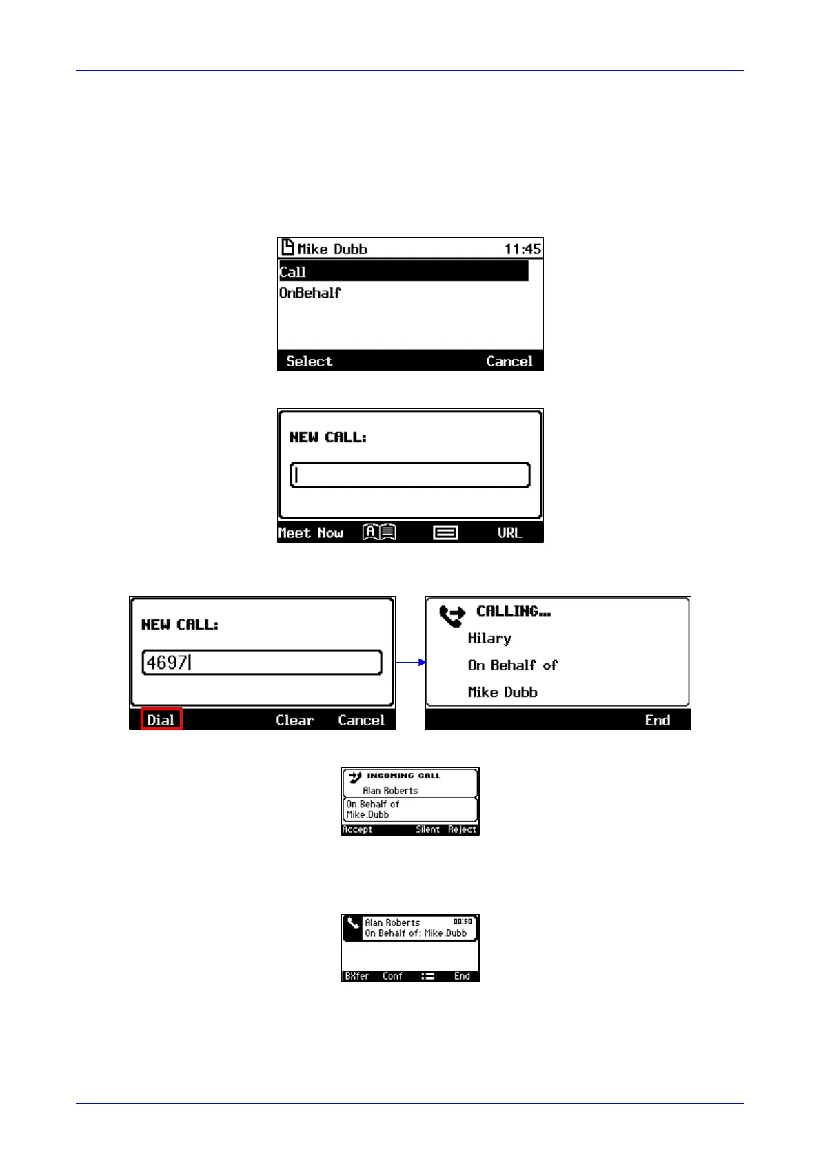 enabled Dial softkey; the number is dialed; Hilary's end rings.
