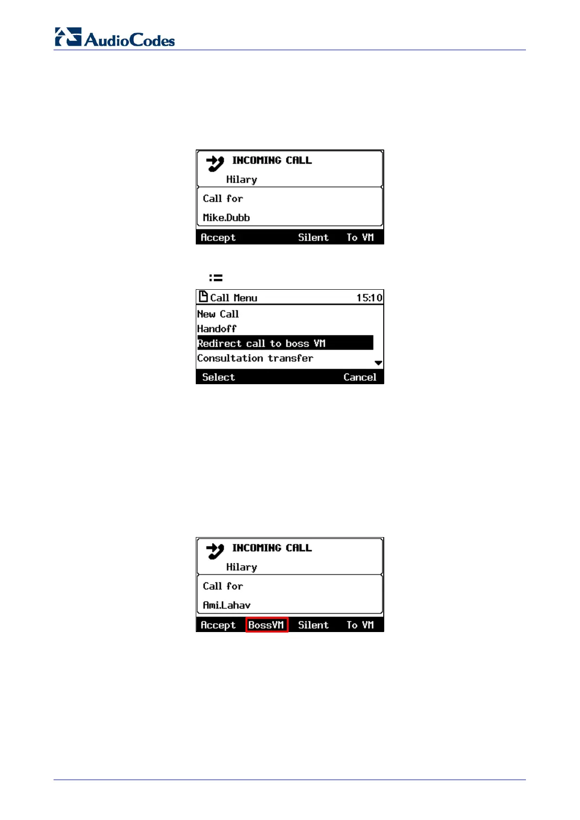 the same time as Boss' phone. Admin's phone displays a BossVM softkey when the call