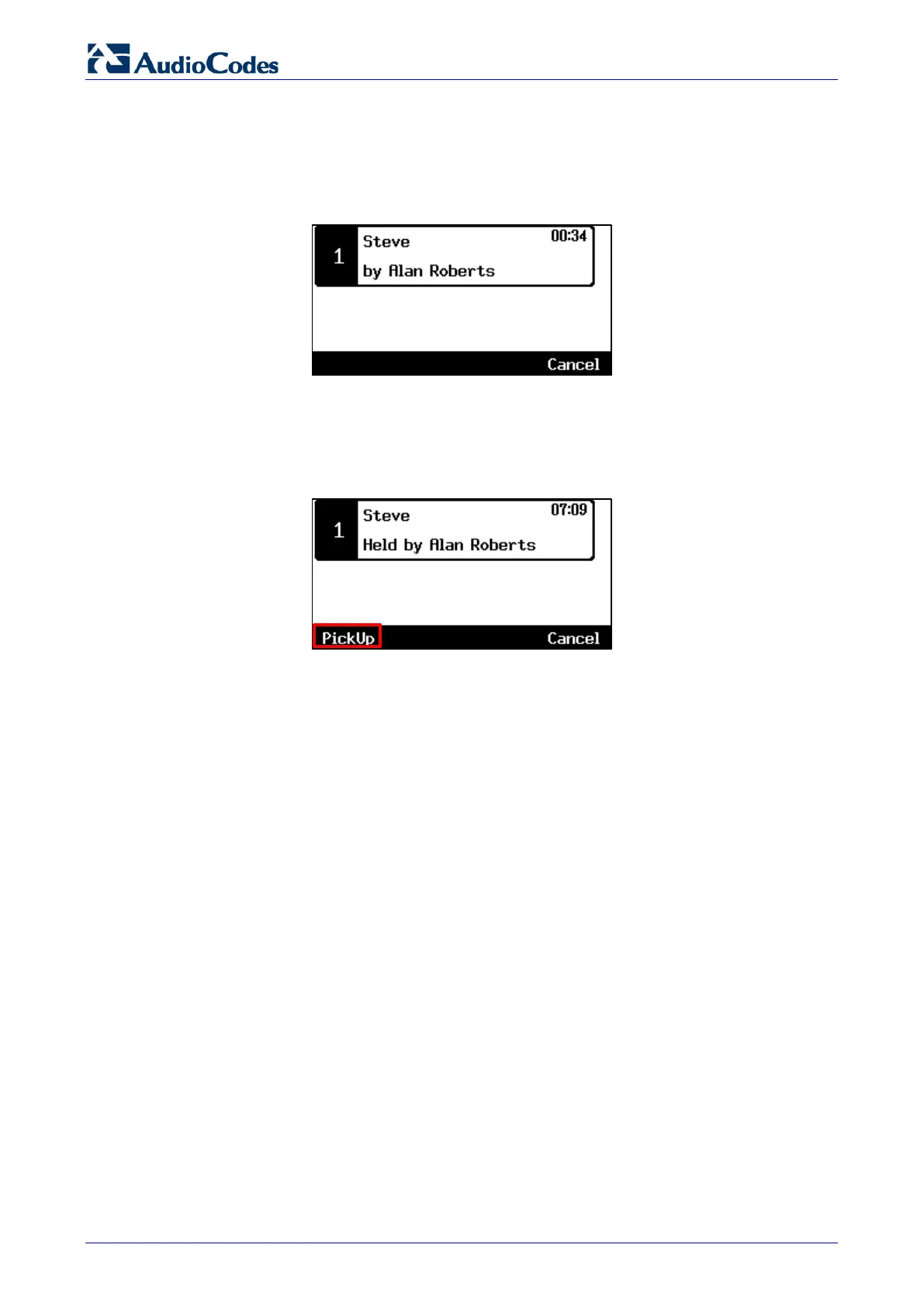 If Admin 2 puts the caller on hold, the Pick up softkey displays in Admin 1's LCD