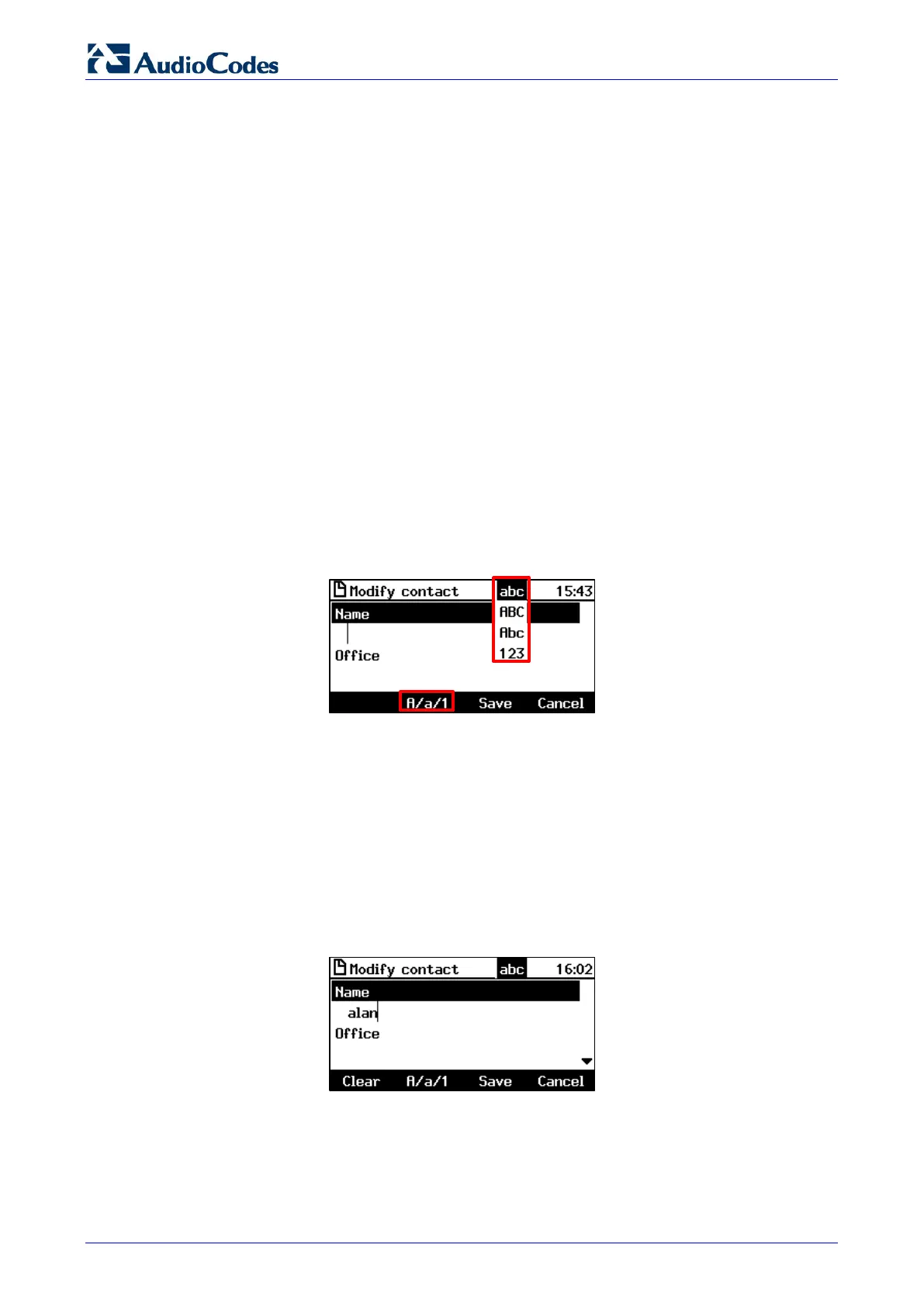1. When configuring a contact, for example, press the A/a/1 softkey: