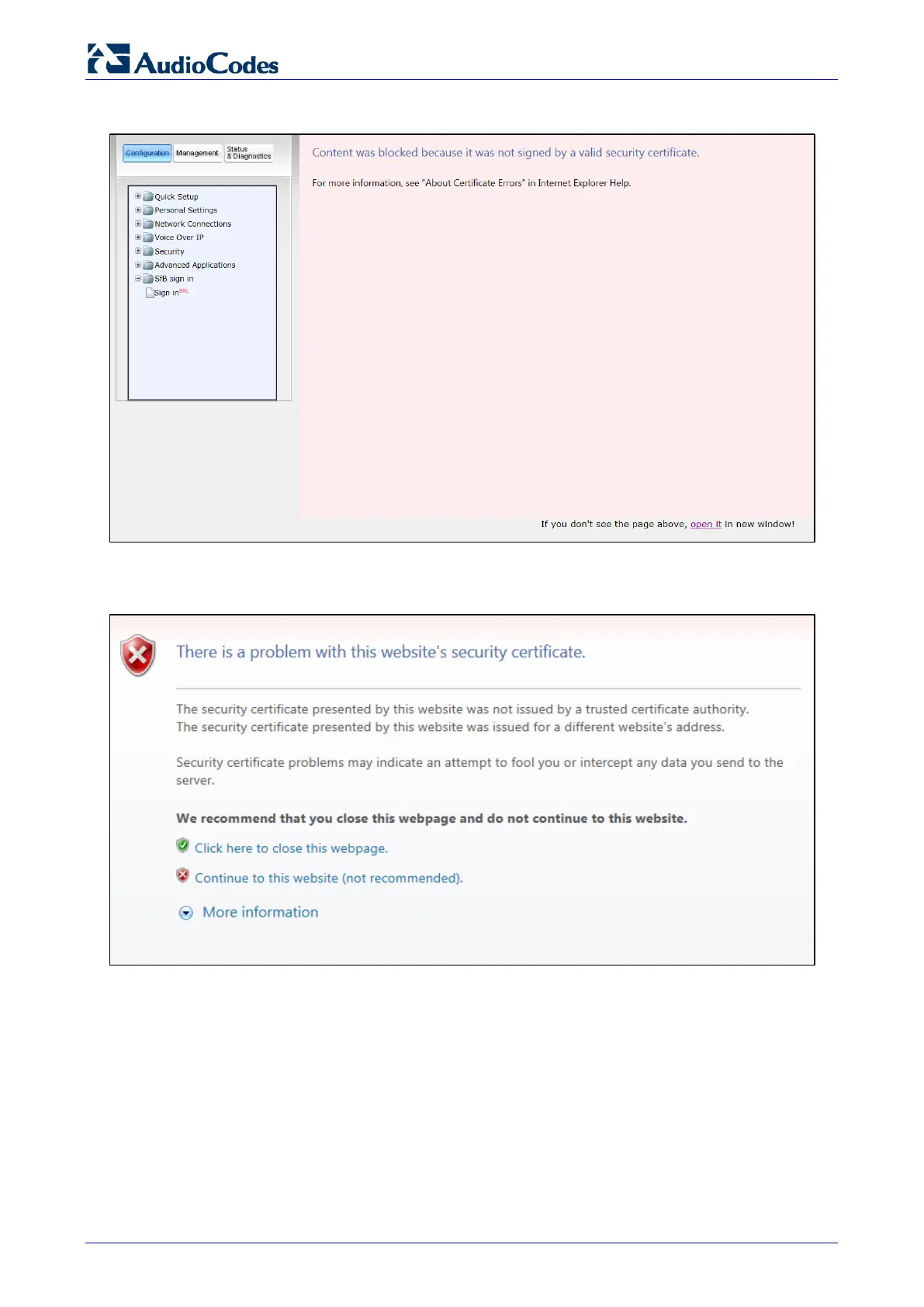 AudioCodes 430HD - Figure 3-8: Sign-In - Content Blocked Page; Figure 3-9: Sign-In - Windows Security Prompt