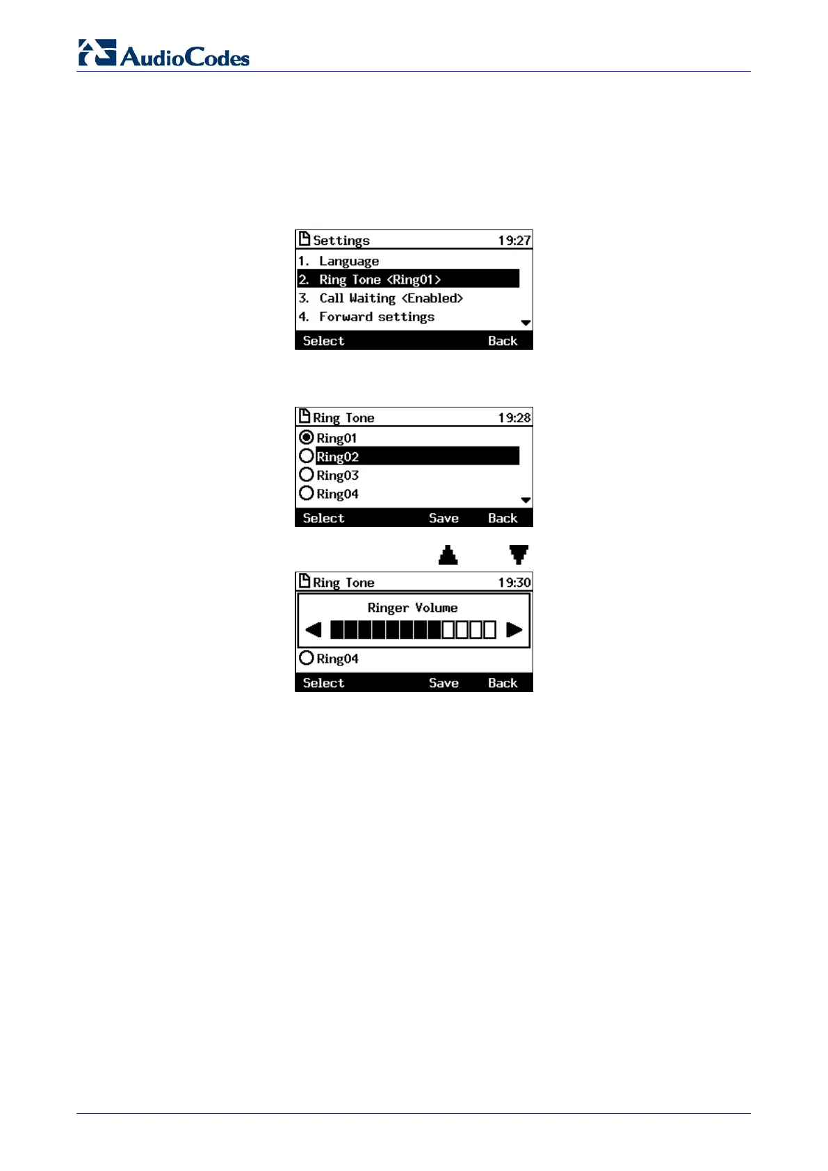 2. Navigate to and select a ring tone. A sample of each ring tone is played as you navigate