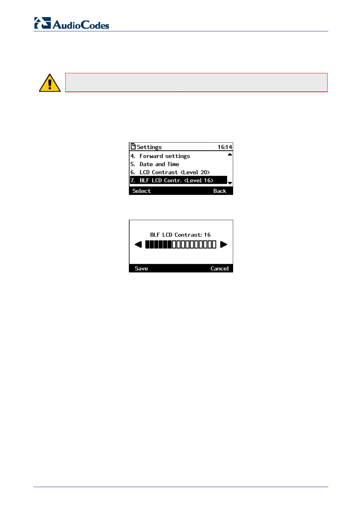 1. Access the BLF LCD Contrast submenu (MENU key > Settings > BLF LCD Contr.).