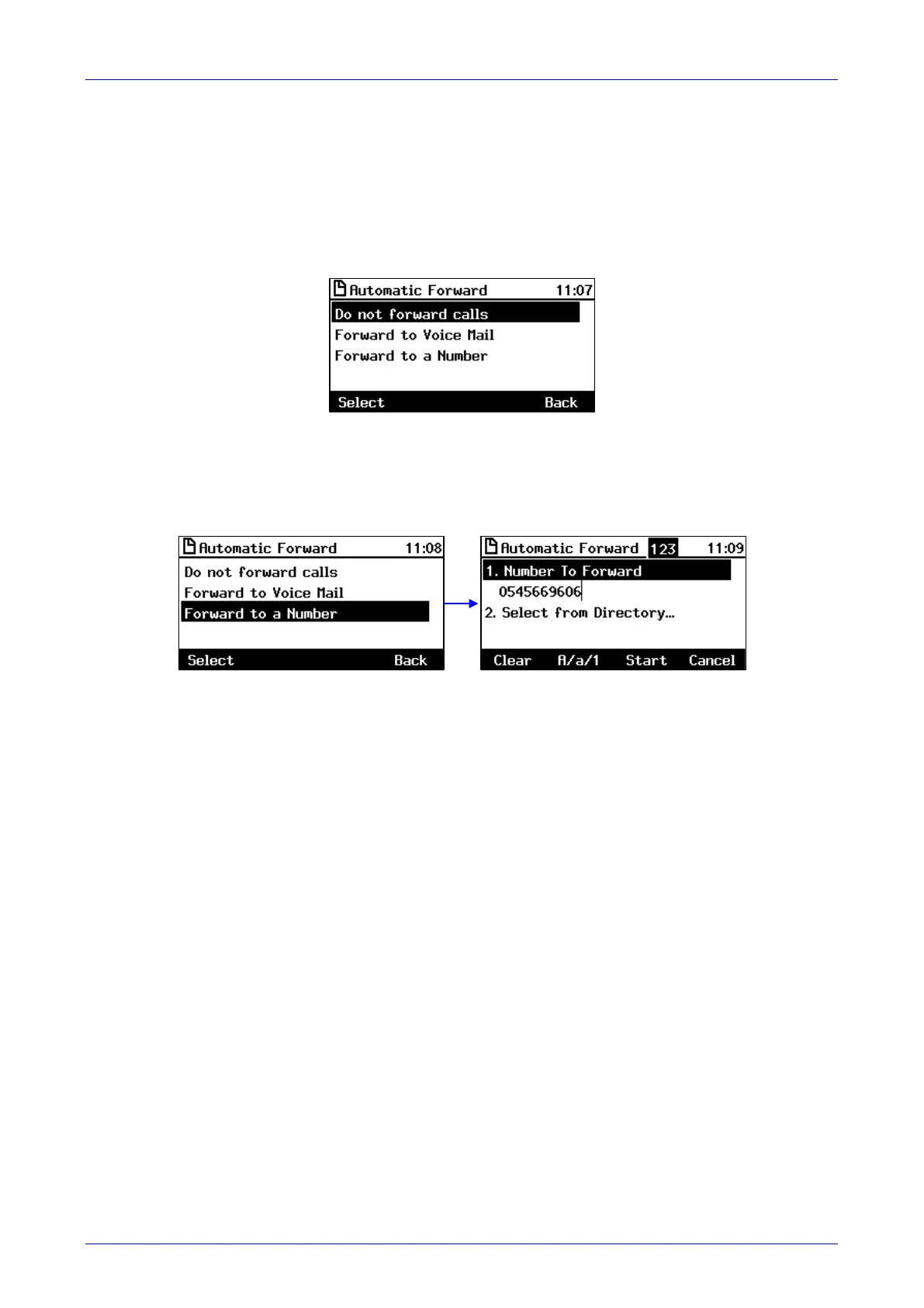 3. To forward to a number: In the Automatic Forward screen, navigate to Forward to a