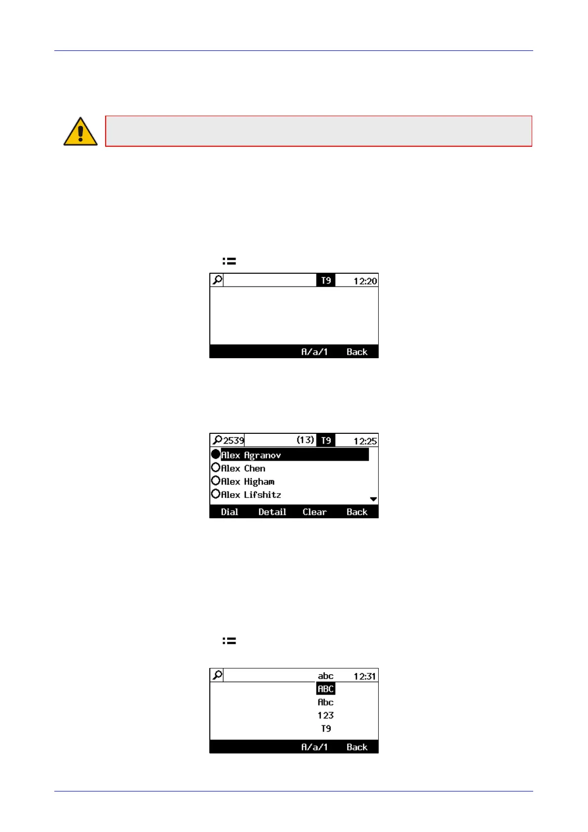 You can search for a contact in the Corporate directory using T9 (default) or A/a/1.