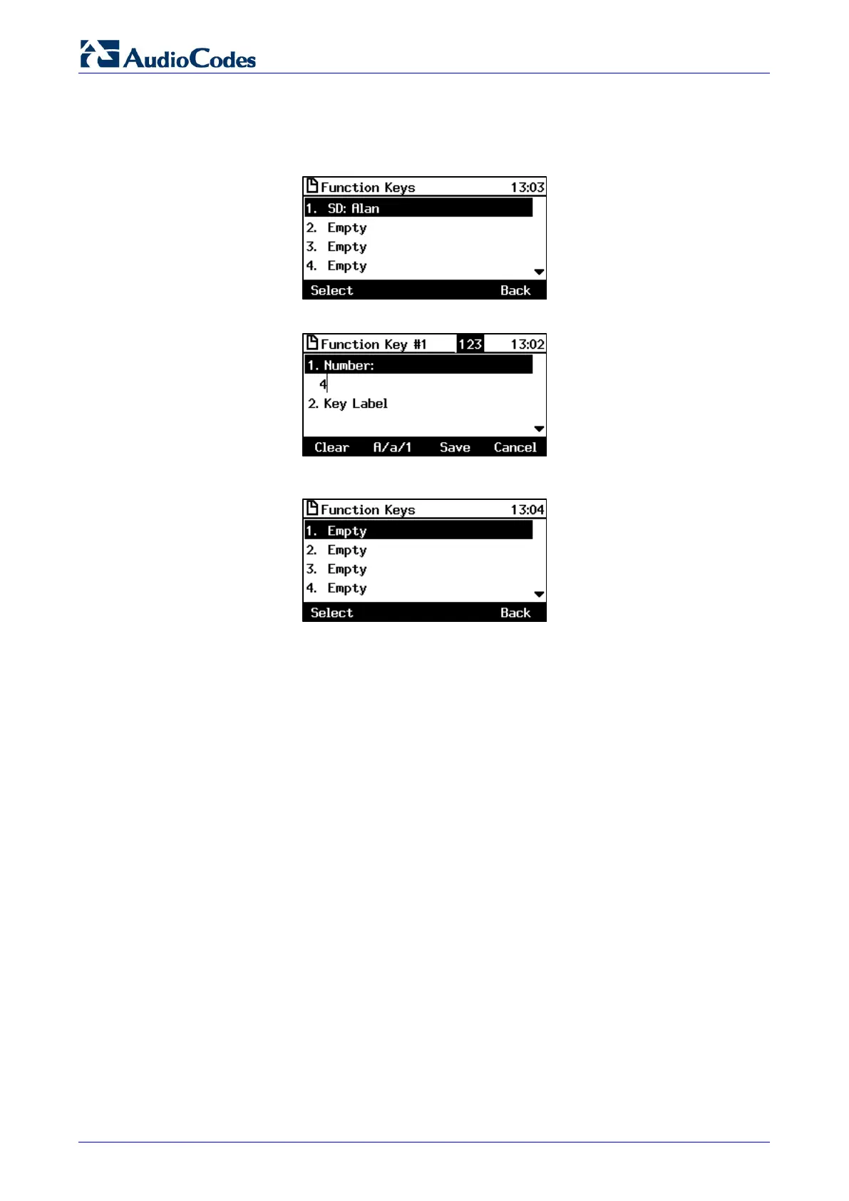 4. Press the Save softkey; the Speed Dial is now listed as 'Empty' in the Function Keys screen: