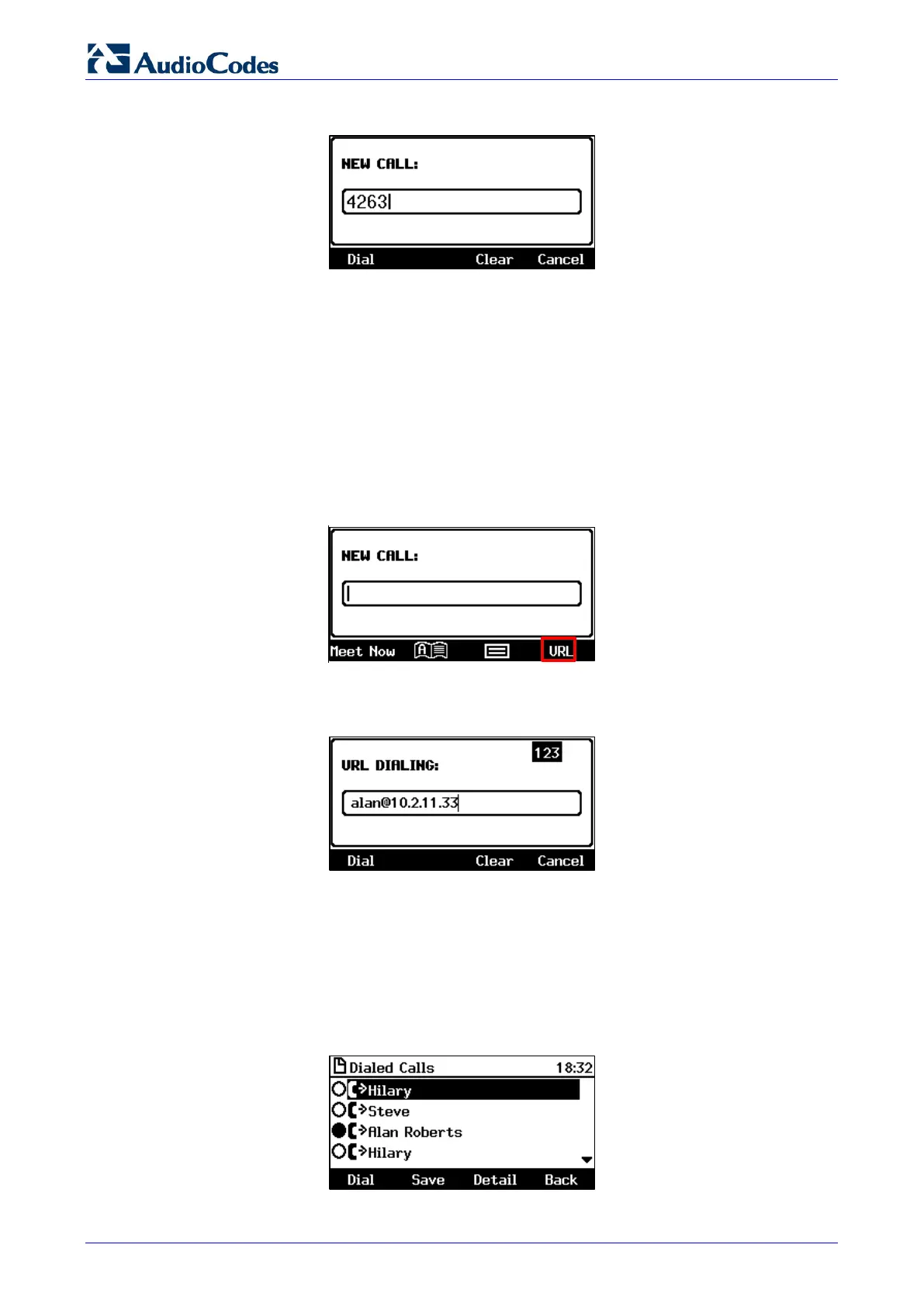 1. Press the speaker key or lift the handset; the LCD displays the NEW CALL field and the URL