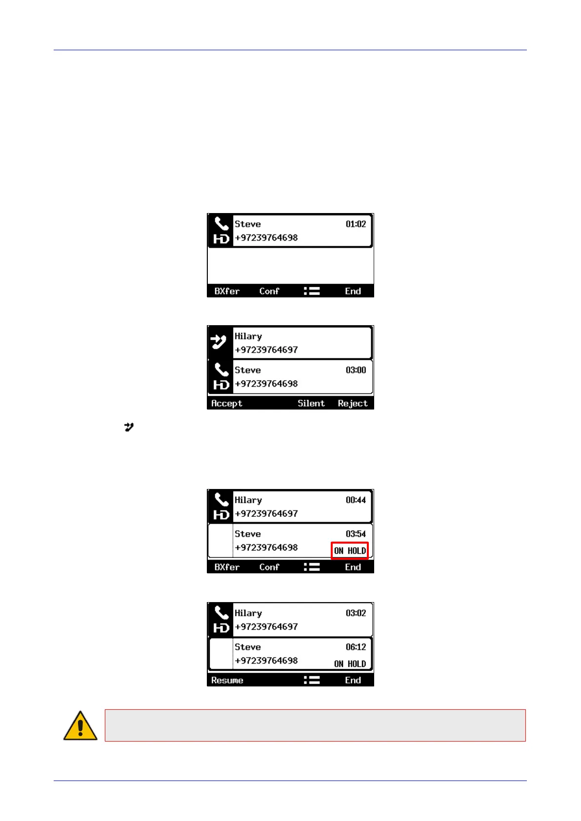 1. Press the Accept softkey; the waiting call from Hilary is answered; the previous call from
