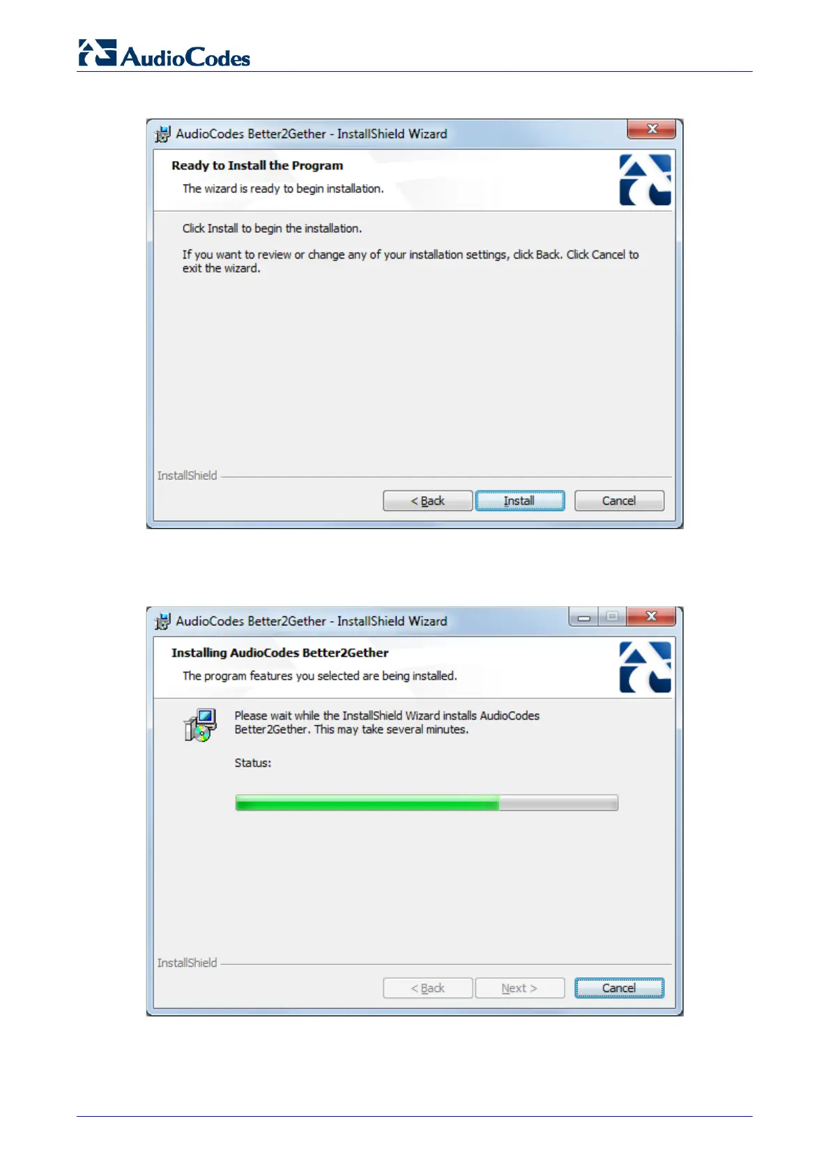 8. Click the Install button; the Installing AudioCodes Better2Gether screen opens indicating