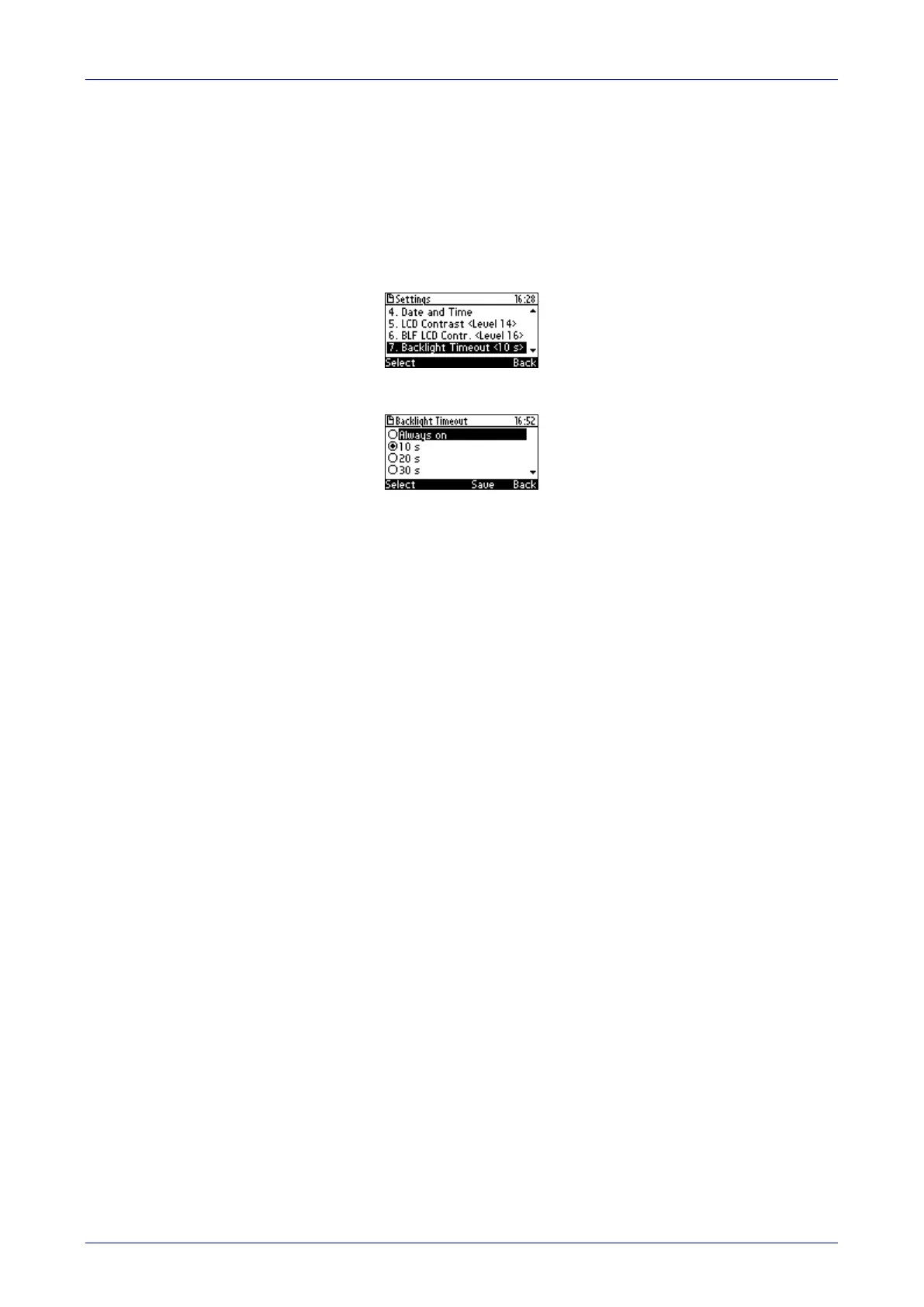 1. Access the Backlight Timeout screen (MENU key > Settings > Backlight Timeout).
