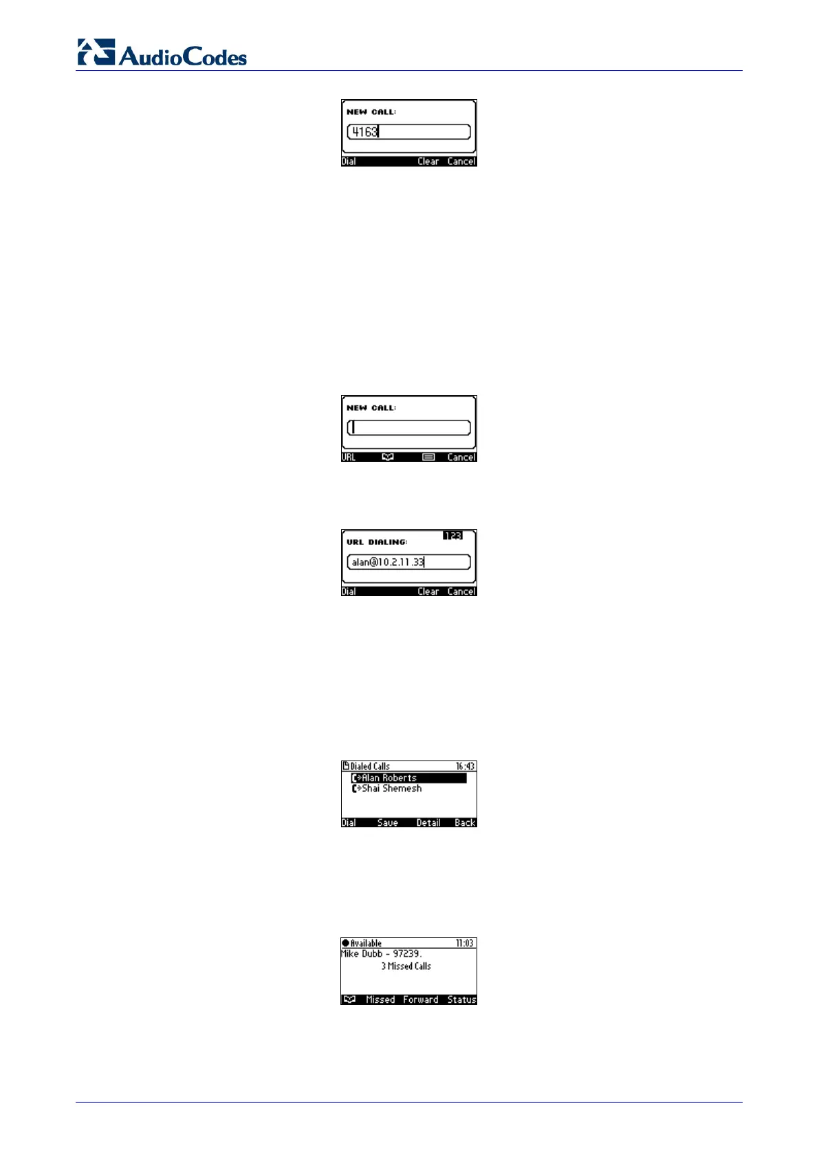1. Press the speaker key or lift the handset; the LCD displays the NEW CALL field and the URL