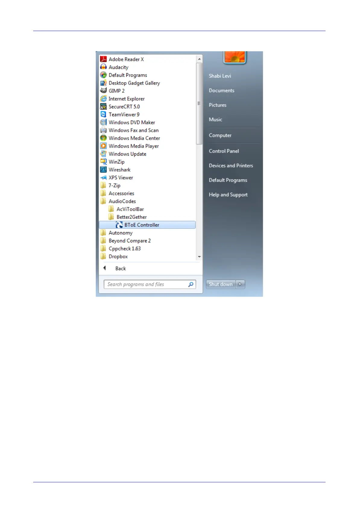 Figure 8-25: Start > Programs > AudioCodes > BToE Controller