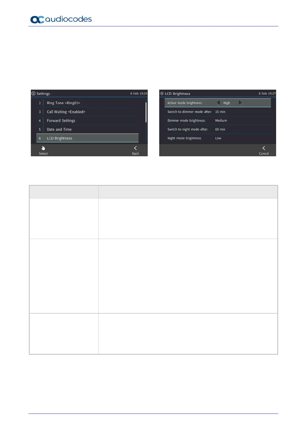 Dimmer mode brightness Defines the brightness of the screen when it's in 'dimmer mode'. The screen