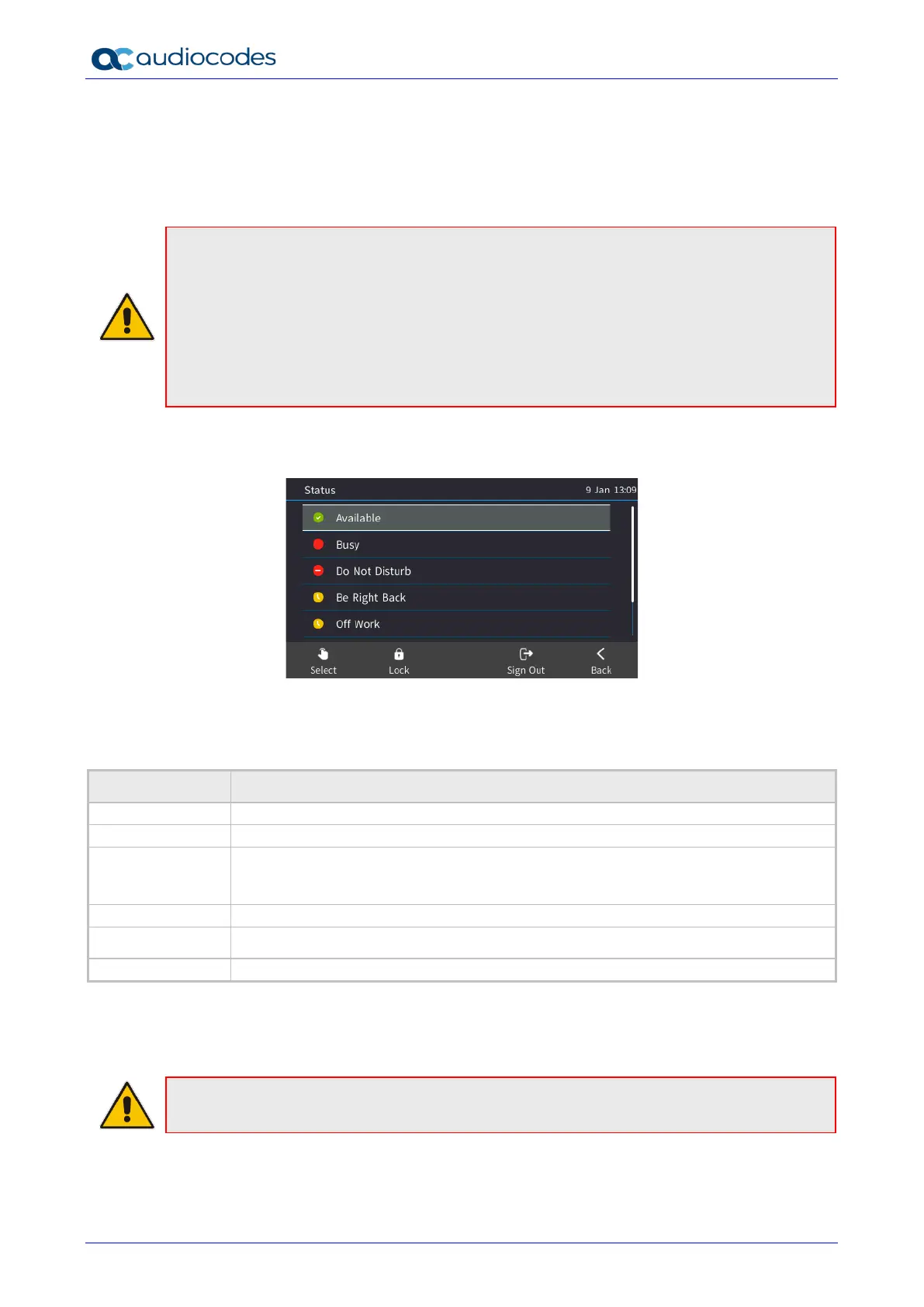 2. Select a presence status. The status you select is displayed in the idle screen. Use the table