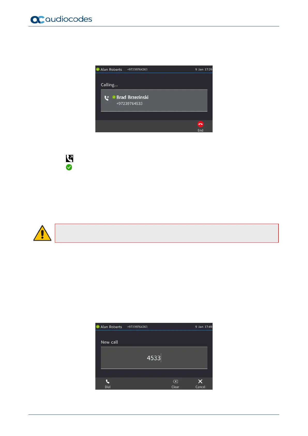 The screen that is displayed after dialing provides caller-friendly orientation information.
