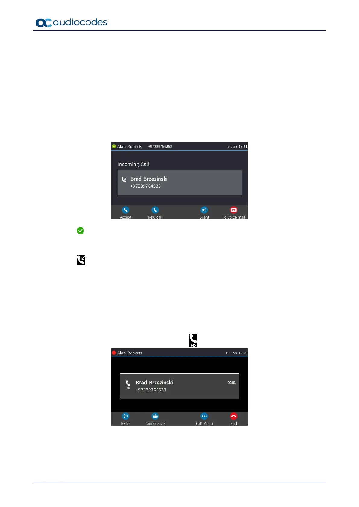 After you answer, the screen displays the icon and the caller’s details and call duration.
