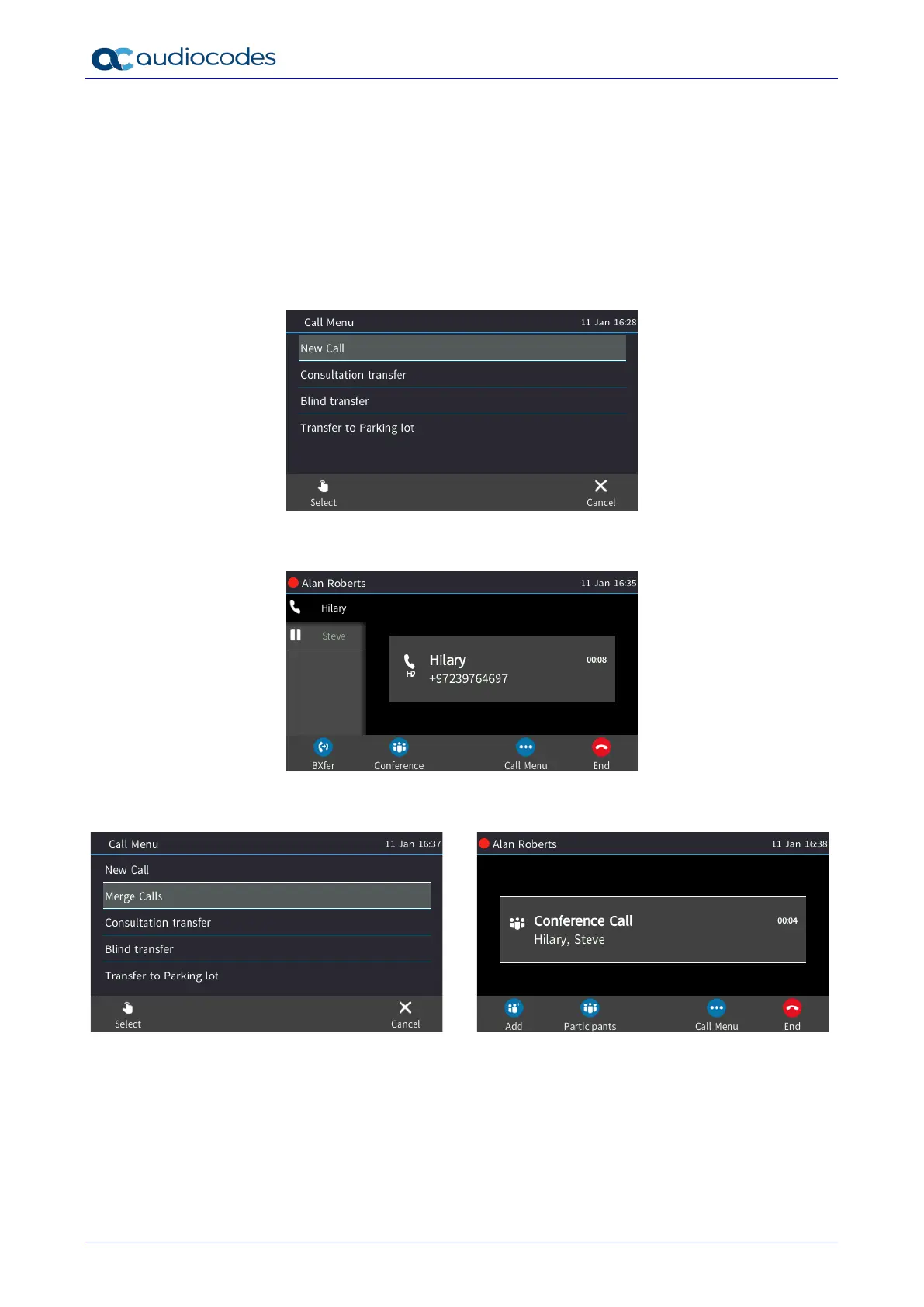 1. When in a call with Steve, you (Alan) decide to add Hilary to the call. Press the Call Menu