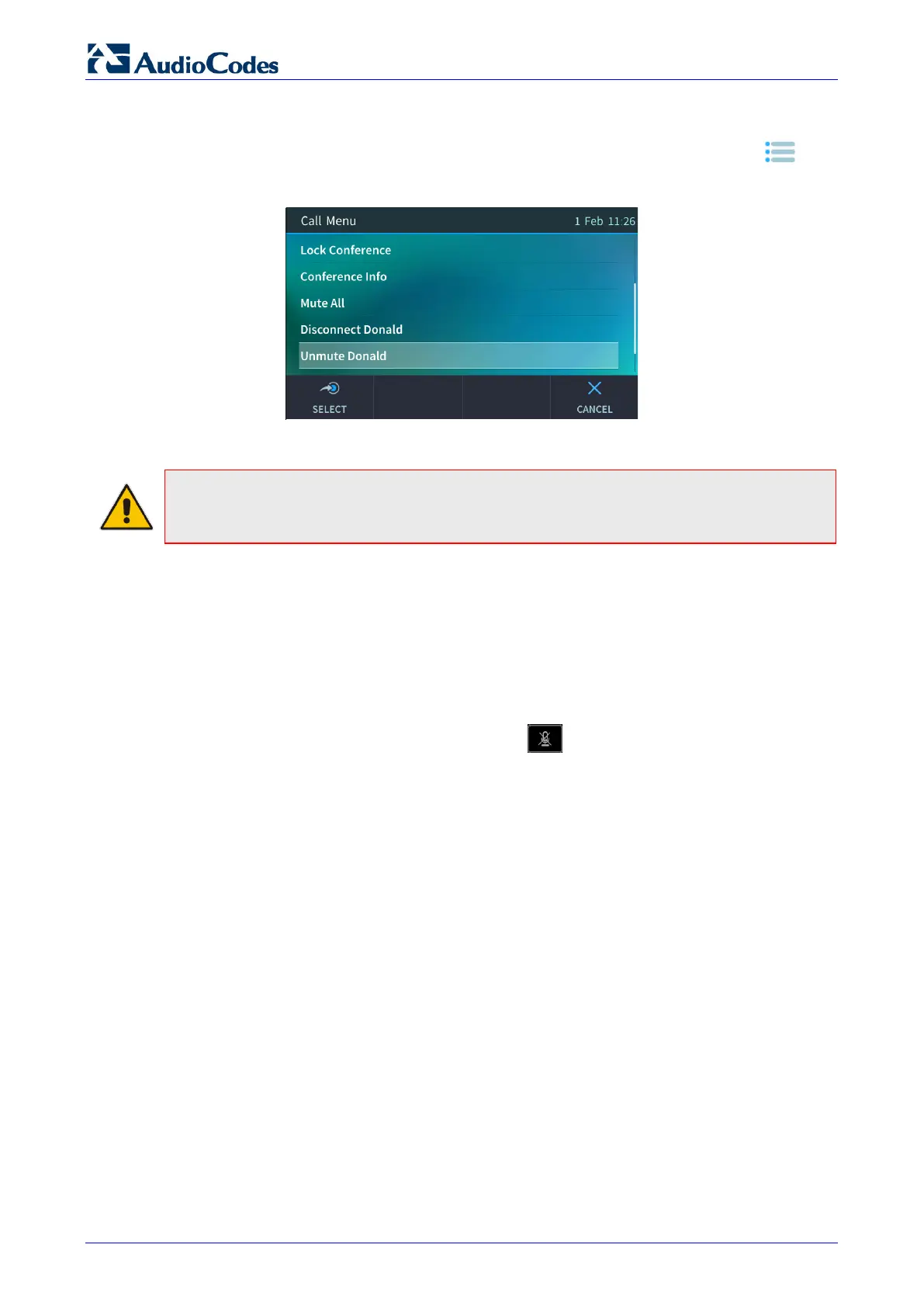 In the Conference screen, touch the participant to unmute, e.g., Donald, touch the Call