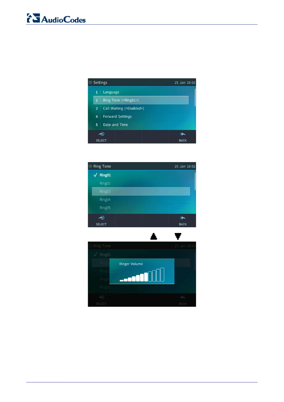 2. Navigate to and select a ring tone. A sample of each ring tone is played as you navigate