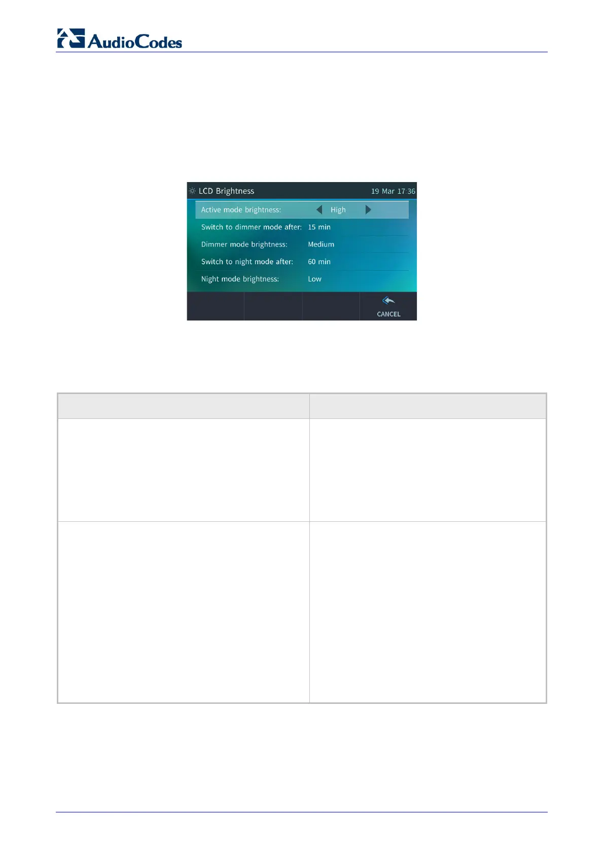 1. Open the LCD Brightness screen (MENU hard key > Settings > LCD Brightness).
