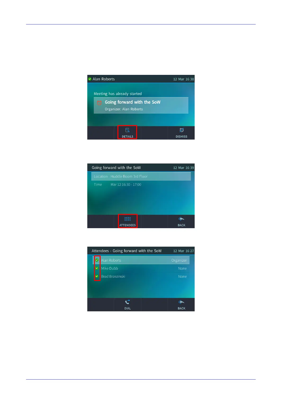 5. Optionally, navigate to an attendee and touch the Dial softkey to dial them.