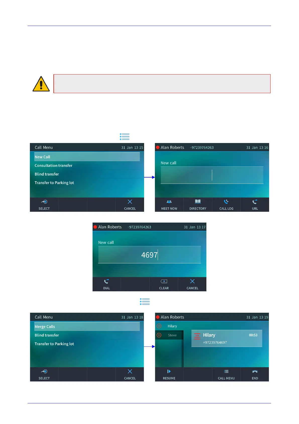 3. When Hilary answers, touch the Call Menu softkey and then select Merge Calls; all