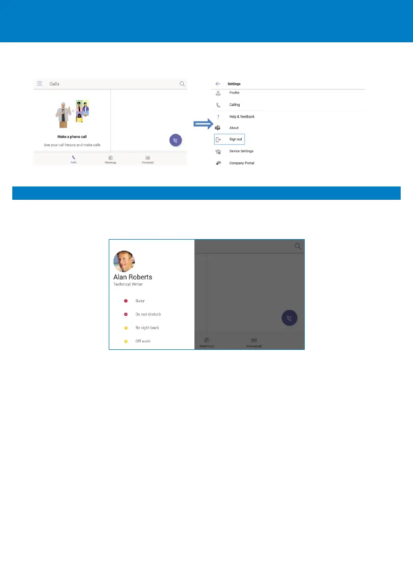 To sign out: Swipe right, touch Settings, and then select the Sign Out option and confirm.