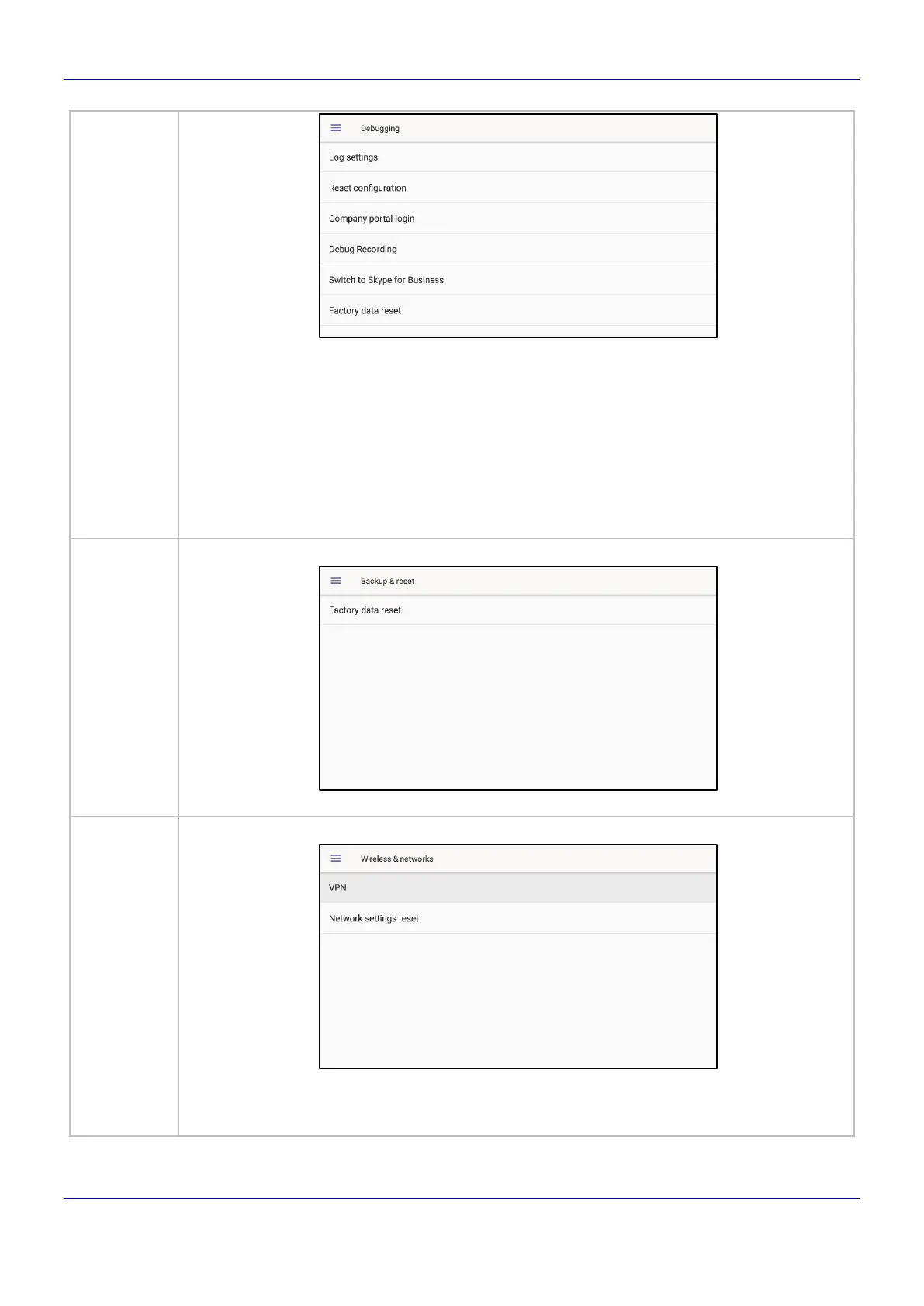 • Factory data reset (the equivalent of restore to defaults; including logout and device reboot).