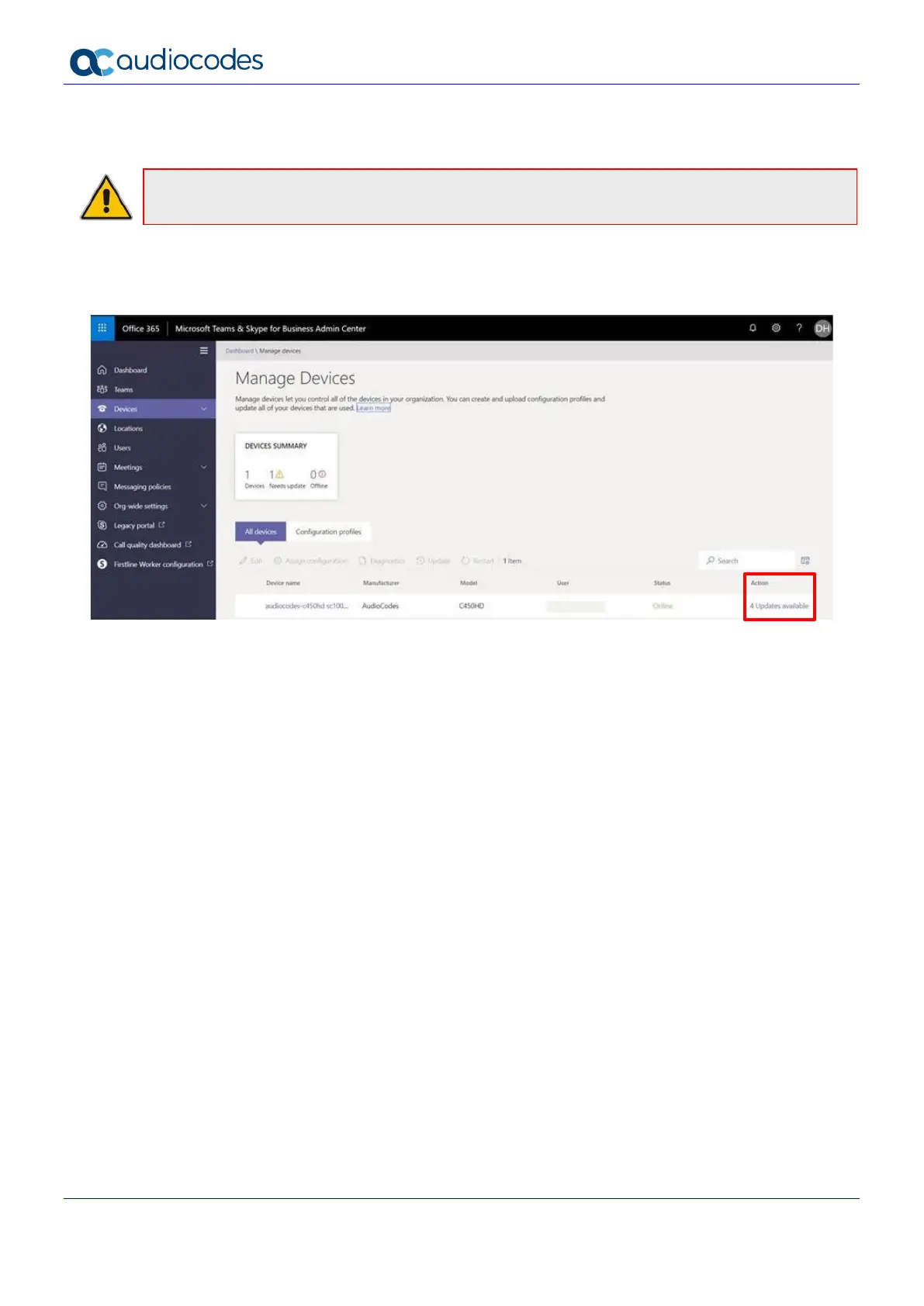 1. In the Microsoft Teams & Skype for Business Admin Center, open the Manage Devices screen.
