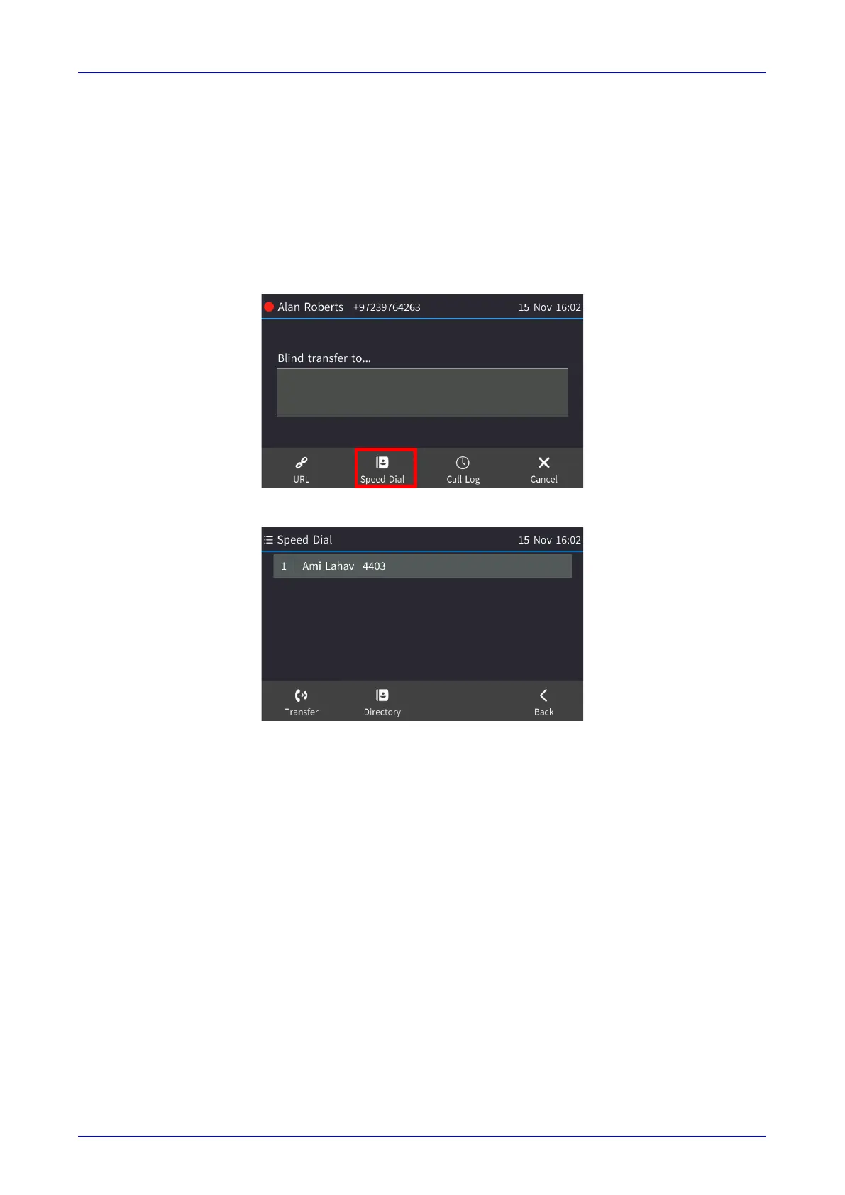 3. In the Speed Dial screen that opens, select the Speed Dial of the contact to transfer the call