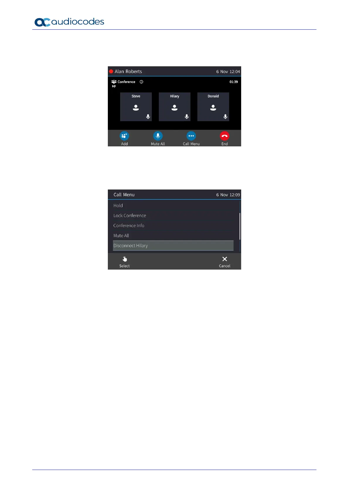 1. In the Conference screen, touch the participant to disconnect (e.g., Hilary).
