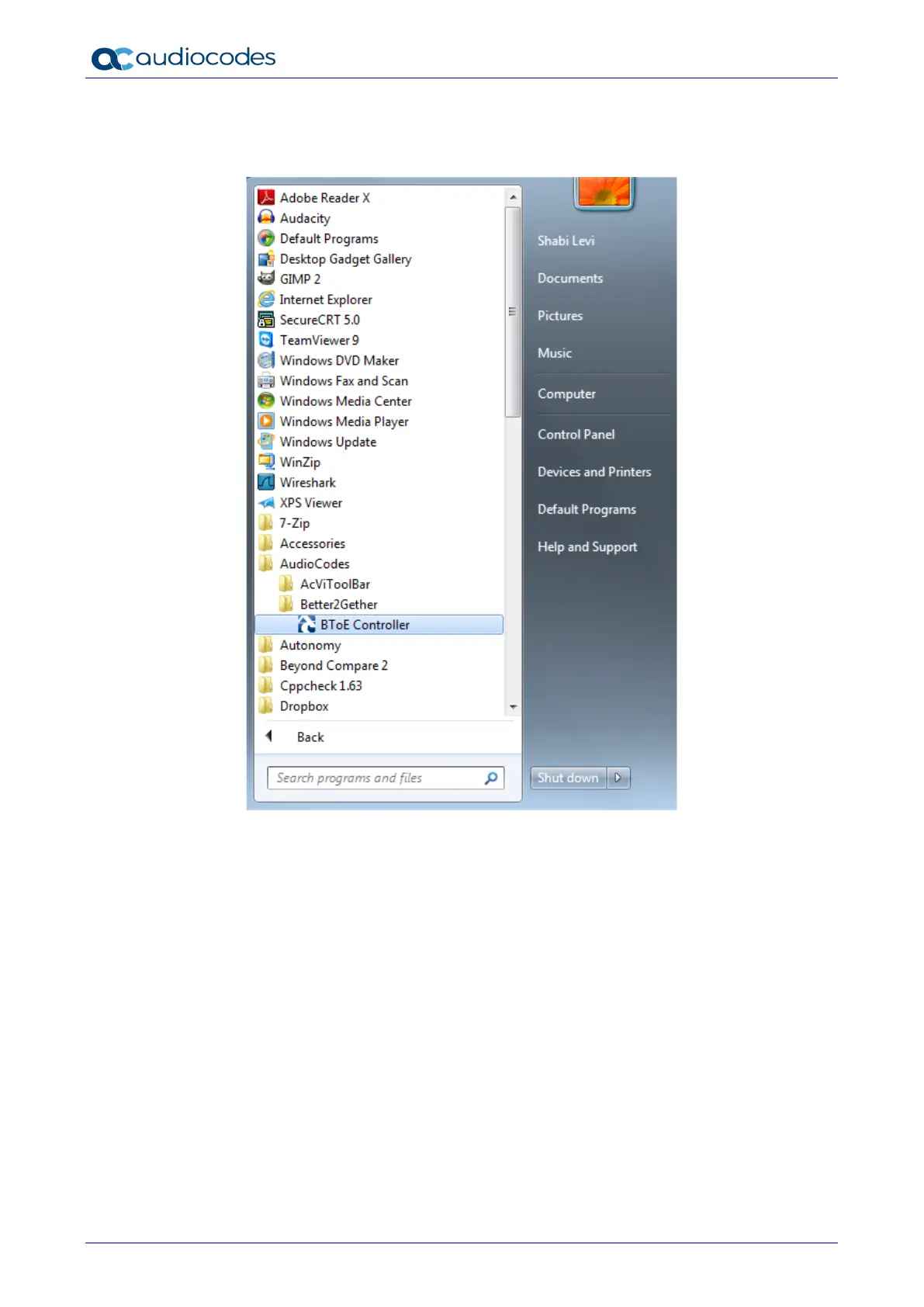Figure 7-25: Start > Programs > AudioCodes > BToE Controller