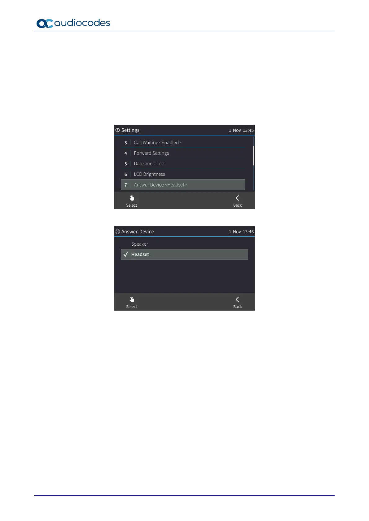 2. Navigate to and select the device (Speaker or Headset) and touch the Select softkey.