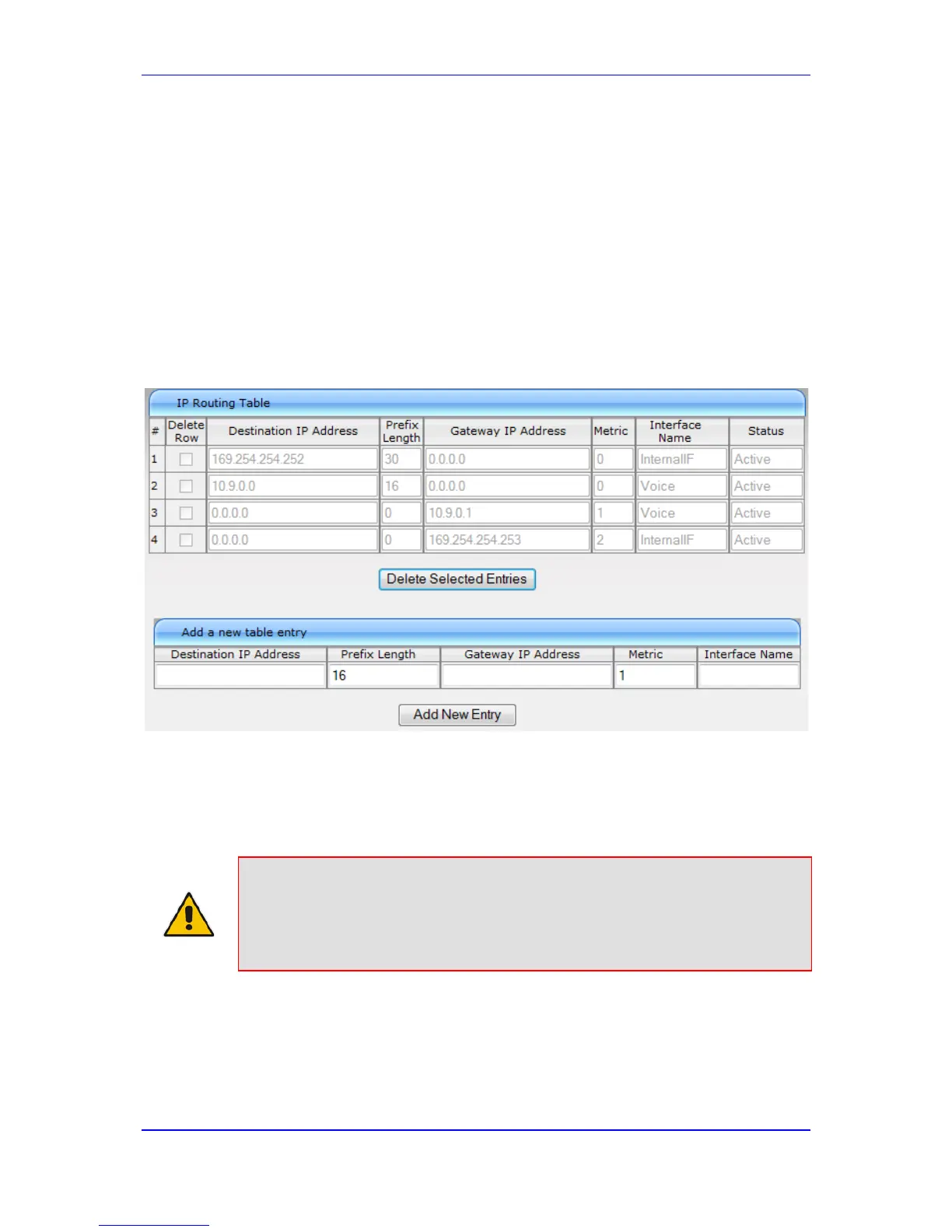 1. Open the IP Routing Table page (Configuration tab > VoIP menu > Network