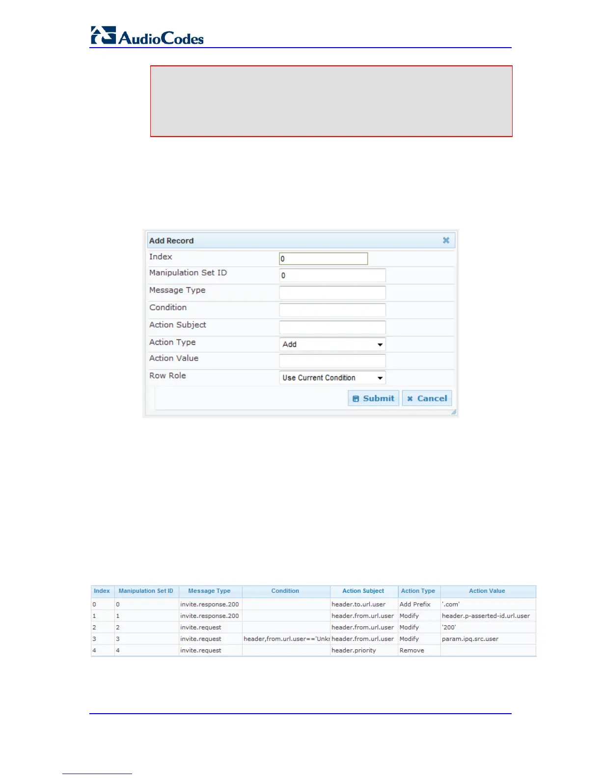 3. Configure the SIP message manipulation rule as required. See the table below for a