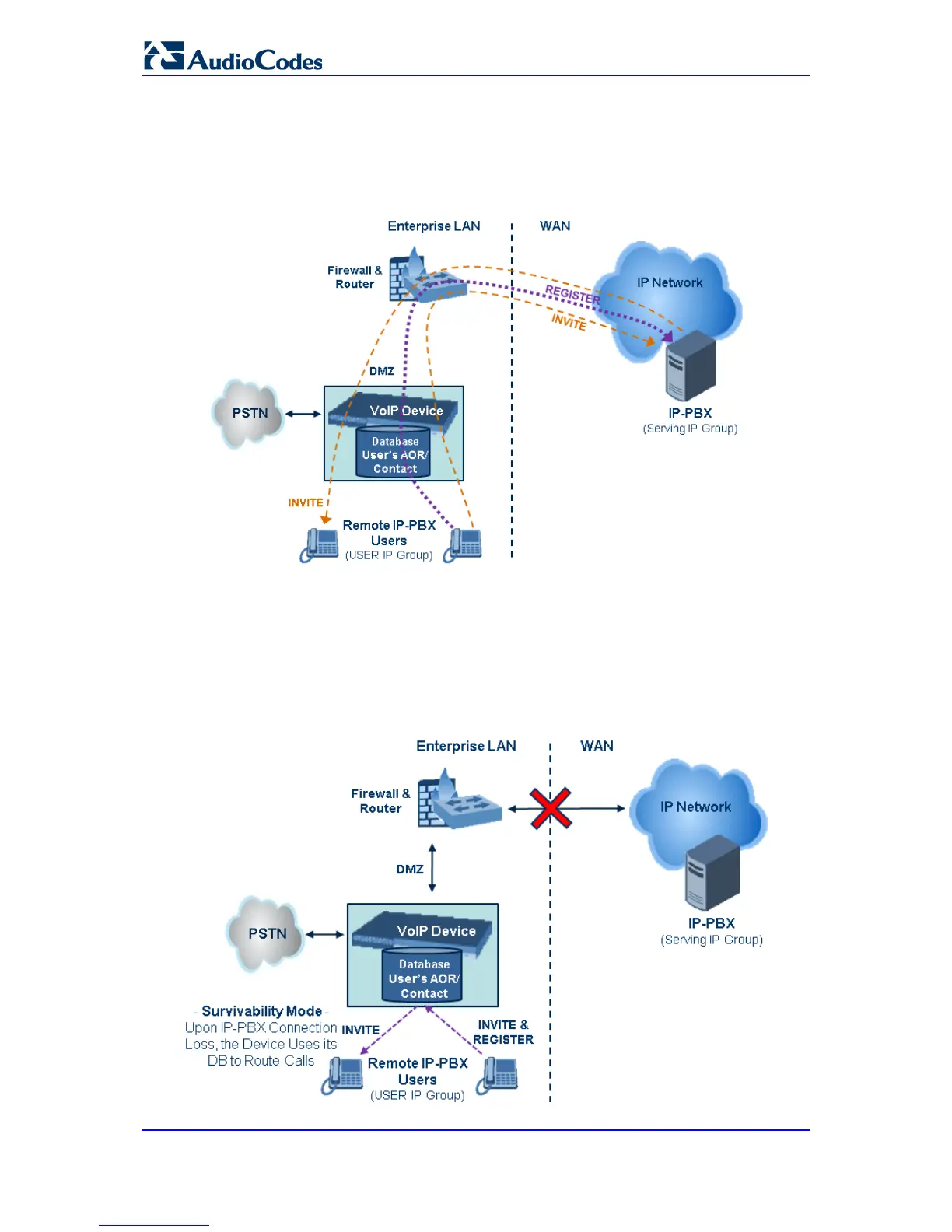 The device also supports the IP-to-IP call routing Survivability mode feature (see the figure