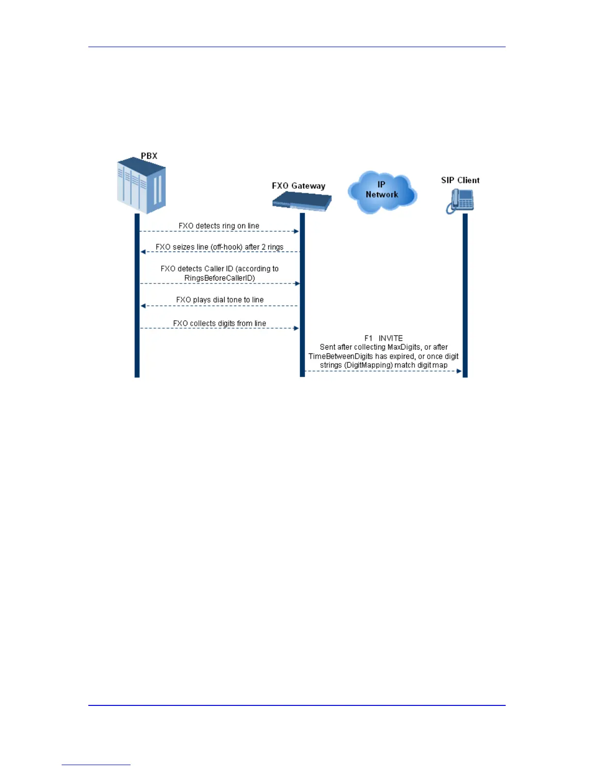 • FXO sends a hook-flash to the PBX, dials the digits (that are received in the