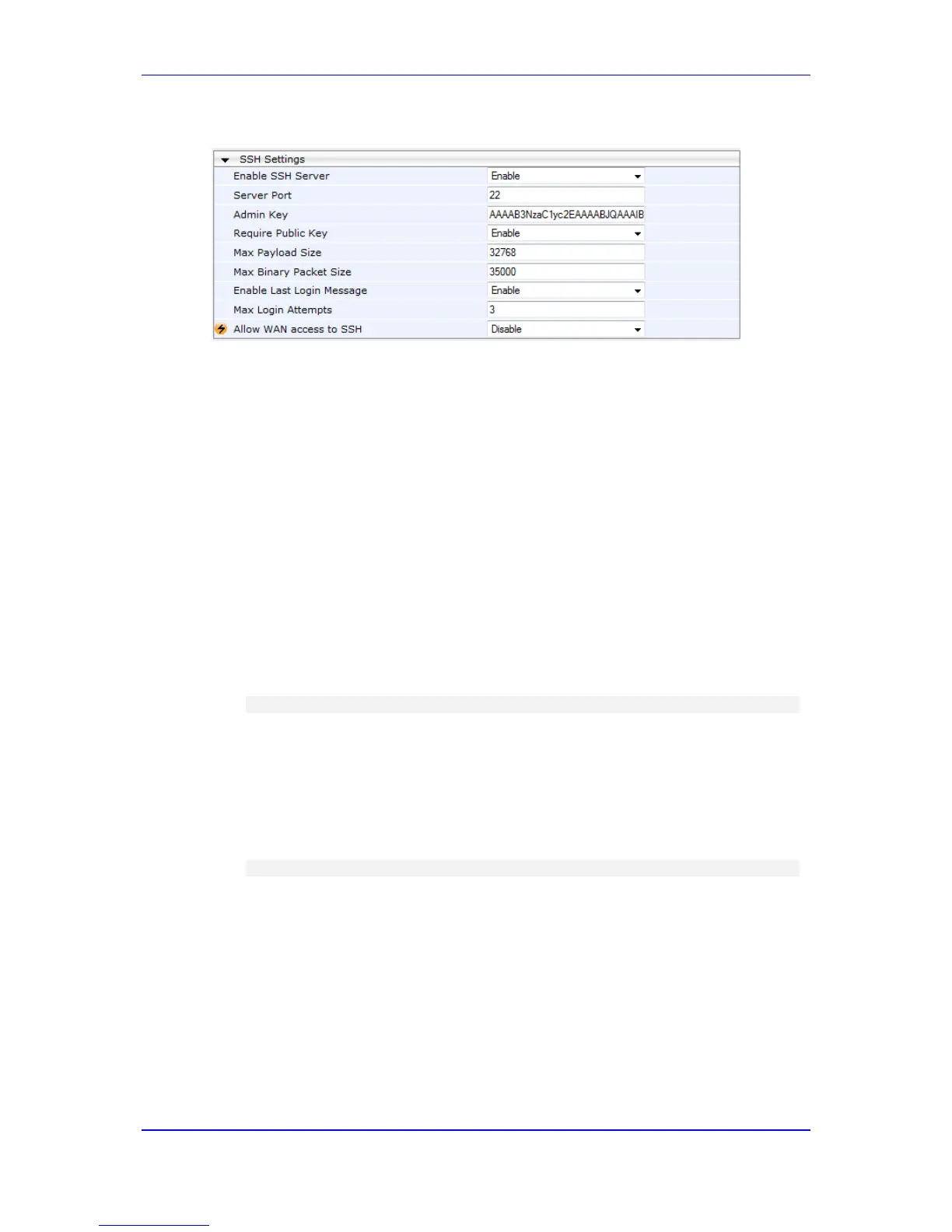 Figure 6-3: SSH Settings - Pasting Public RSA Key in 'Admin Key' Field