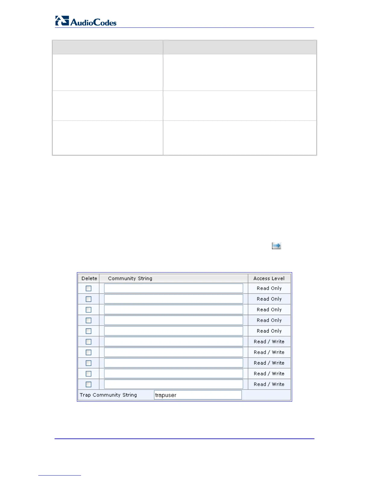 3. Configure the SNMP community strings parameters according to the table below.