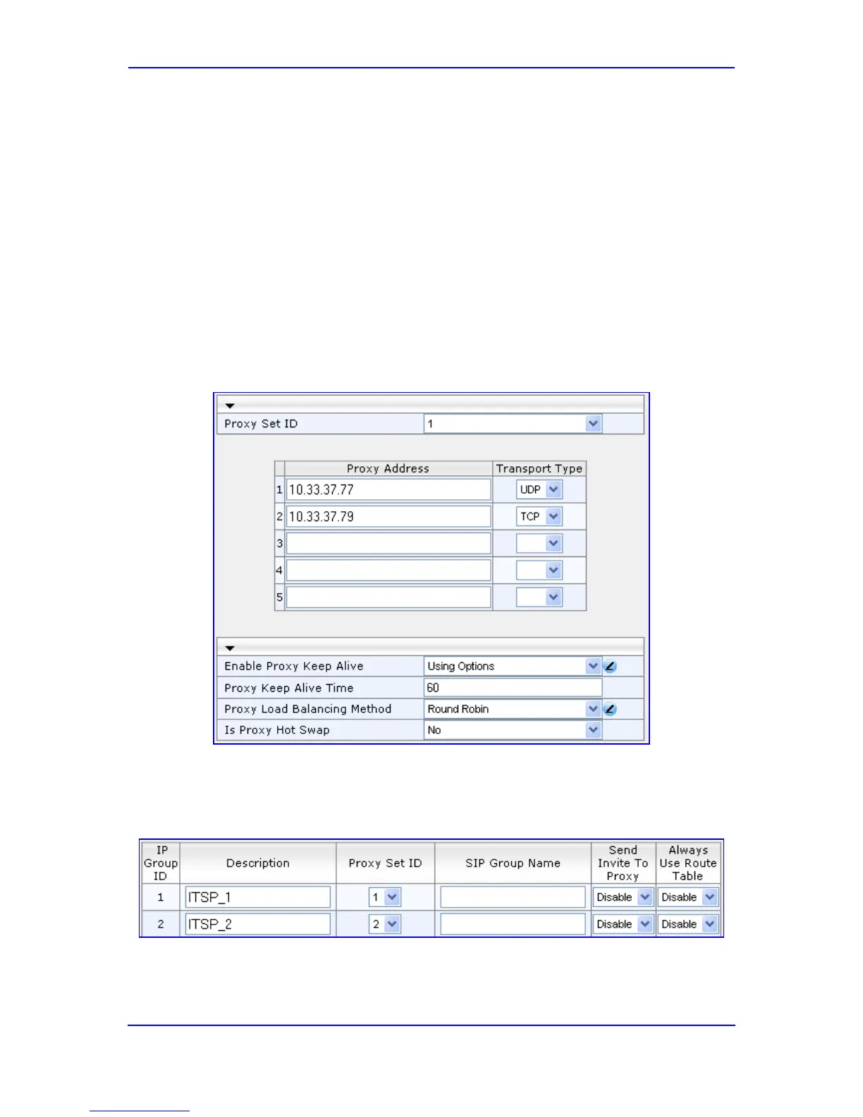 • Proxy Set #1 includes two IP addresses of the first ITSP (ITSP 1
