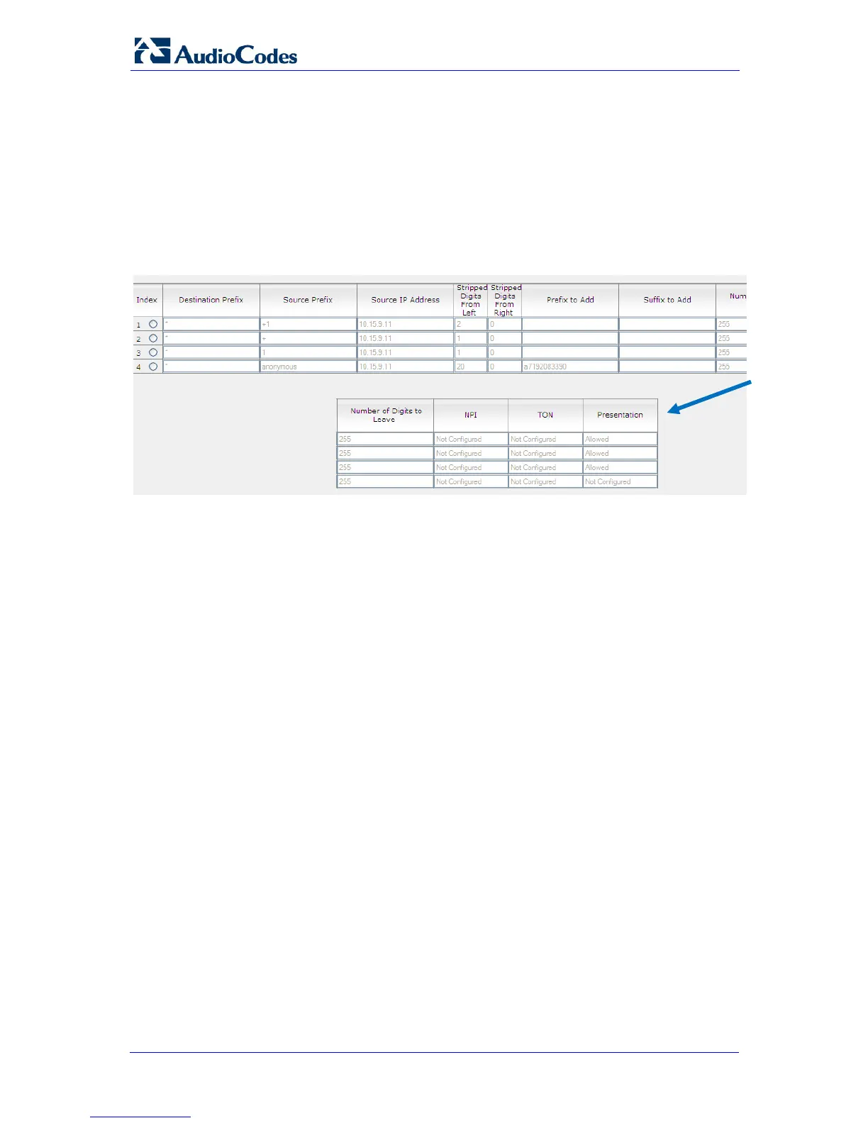• Index #2 defines Source number manipulation of IP calls from Lync